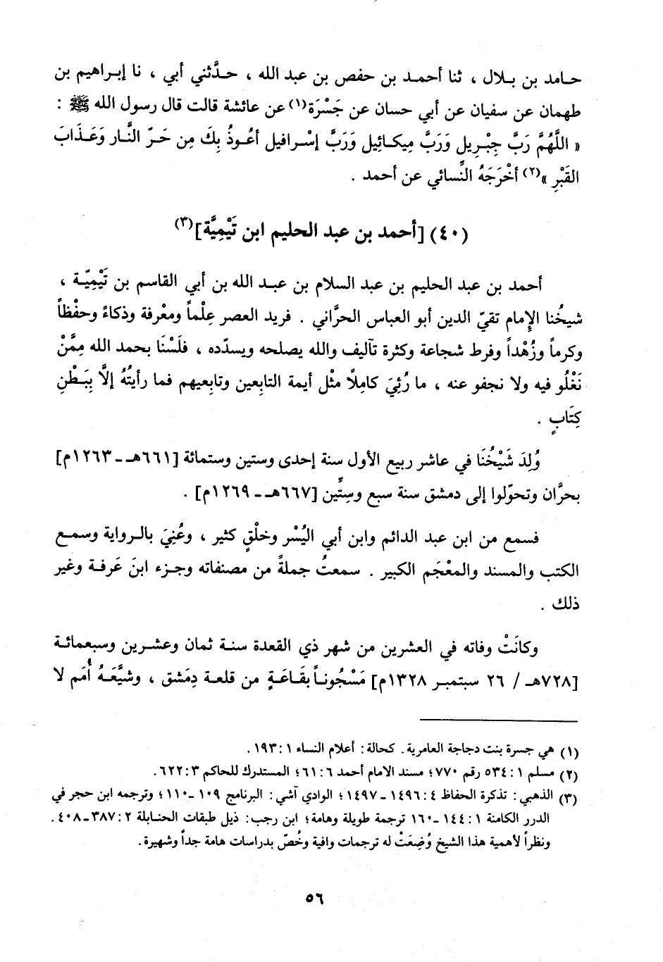حَامِدِ بْنُ بِلالٍ، ثنا أَحْمَدُ بْنُ حَفْصِ بْنِ عَبْدِ اللَّهِ، حَدَّثَنِي أَبِي، نا إِبْرَاهِيمُ بْنُ طَهْمَانَ، عَنْ سُفْيَانَ، عَنْ أَبِي حَسَّانٍ، عَنْ جَسْرَةَ، عَنْ عَائِشَةَ، قَالَتْ: قَالَ رَسُولُ اللَّهِ صَلَّى اللَّهُ عَلَيْهِ وَسَلَّمَ: «اللَّهُمَّ رَبَّ جِبْرِيلَ، وَرَبَّ مِيكَائِيلَ، وَرَبَّ إِسْرَافِيلَ , أَعُوذُ بِكَ مِنْ حَرِّ النَّارِ وَعَذَابِ الْقَبْرِ» .