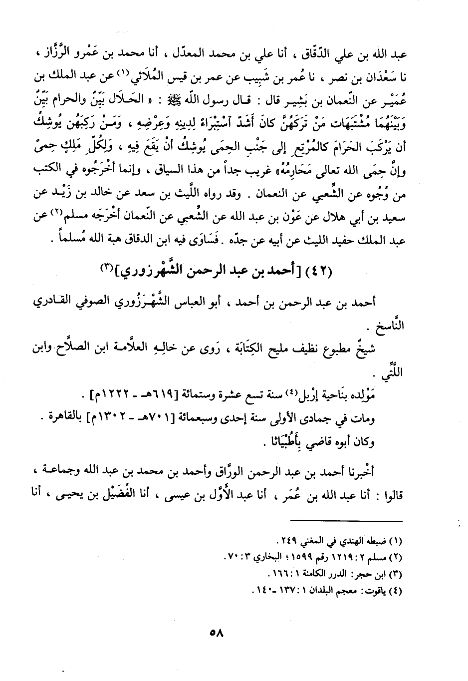 عَبْدُ اللَّهِ بْنُ عَلِيٍّ الدَّقَّاقُ، أنا عَلِيُّ بْنُ مُحَمَّدٍ الْمُعَدَّلُ، أنا مُحَمَّدُ بْنُ عَمْرٍو الرَّزَّازُ، نا سَعْدَانُ بْنُ نَصْرٍ، نا عُمَرُ بْنُ شَبِيبٍ، عَنْ عُمَرَ بْنِ قَيْسٍ الْمُلائِيِّ، عَنْ عَبْدِ الْمَلِكِ بْنِ عُمَيْرٍ، عَنِ النُّعْمَانِ بْنِ بَشِيرٍ، قَالَ: قَالَ رَسُولُ اللَّهِ صَلَّى اللَّهُ عَلَيْهِ وَسَلَّمَ: «الْحَلالُ بَيِّنٌ وَالْحَرَامُ بَيِّنٌ وَبَيْنَهُمَا مَشْتَبَهَاتٌ، مَنْ تَرَكَهُنَّ كَانَ أَشَدَّ اسْتِبْرَاءً لِدِينِهِ وَعِرْضِهِ، وَمَنْ رَكَبَهُنَّ يُوشِكُ أَنْ يَرْكَبَ الْحَرَامَ كَالْمُرْتَعِ إِلَى جَنْبِ الْحِمَى يُوشِكُ أَنْ يَقَعَ فِيهِ، وَلِكُلِّ مَلِكٍ حِمًى وَإِنَّ حِمَى اللَّهِ تَعَالَى مَحَارِمُهُ» .