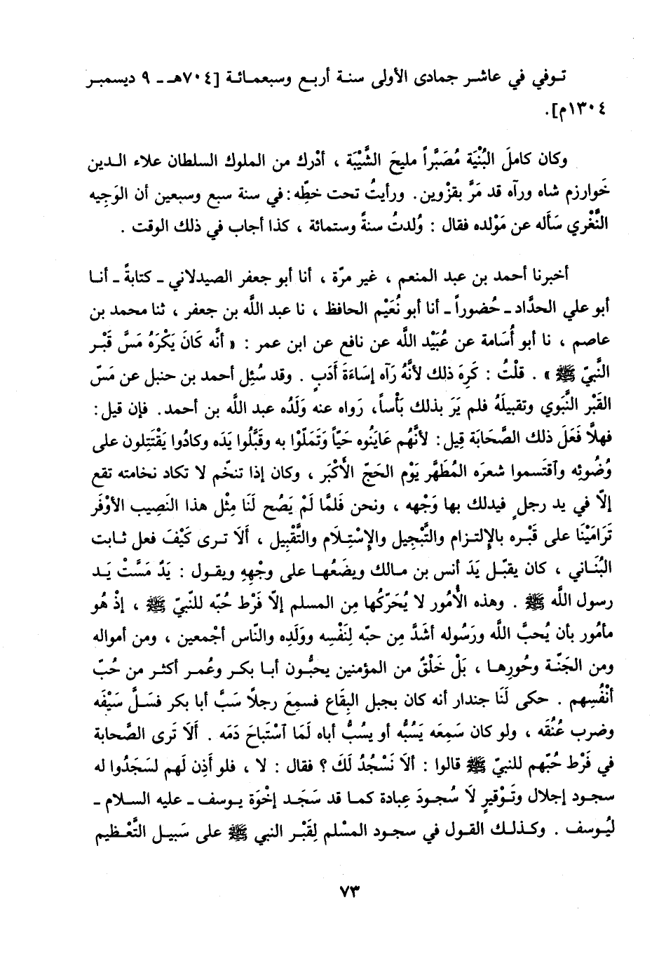 فَإِنْ قِيلِ: فَهَلا فَعَلَ ذَلِكَ الصَّحَابَةُ؟ قِيلَ: لأَنَّهُمْ عَايَنُوهُ حَيًّا وَتَمَلَّوْا بِهِ وَقَبَّلُوا يَدَهُ وَكَادُوا يَقْتَتِلُونَ عَلَى وُضُوئِهِ وَاقْتَسَمُوا شَعْرَهُ الْمُطَهَّرَ يَوْمَ الْحَجِّ الأَكْبَرِ، وَكَانَ إِذَا تَنَخَّمَ لا تَكَادُ نُخَامَتُهُ تَقَعُ إِلا فِي يَدِ رَجُلٍ فَيُدَلِّكُ بِهَا وَجْهَهُ، وَنَحْنُ فَلَمَّا لَمْ يَصِحْ لَنَا مِثْلُ هَذَا النَّصِيبِ الأَوْفَرِ تَرَامَيْنَا عَلَى قَبْرِهِ بِالالْتِزَامِ وَالتَّبْجِيلِ وَالاسْتِلامِ وَالتَّقْبِيلِ، أَلا تَرَى كَيْفَ فَعَلَ ثَابِتٌ الْبُنَانِيُّ؟ كَانَ يُقَبِّلُ يَدَ أَنَسِ بْنِ مَالِكٍ وَيَضَعُهَا عَلَى وَجْهِهِ وَيَقُولُ: يَدٌ مَسَّتْ يَدَ رَسُولِ اللَّهِ صَلَّى اللَّهُ عَلَيْهِ وَسَلَّمَ.
