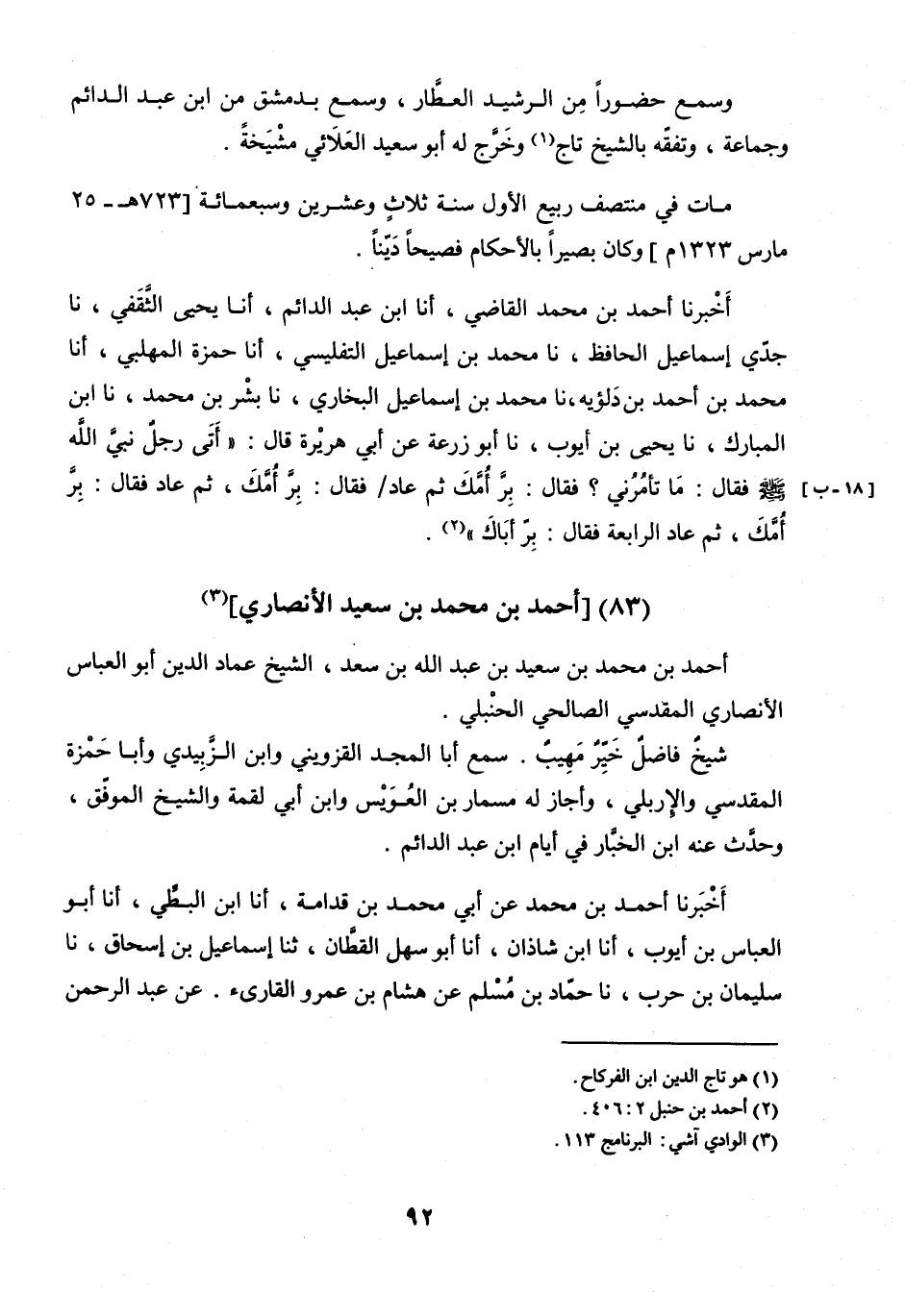 أَخْبَرَنَا أَحْمَدُ بْنُ مُحَمَّدٍ الْقَاضِي، أنا ابْنُ عَبْدِ الدَّائِمِ، أنا يَحْيَى الثَّقَفِيُّ، نا جَدِّي إِسْمَاعِيلُ الْحَافِظُ، نا مُحَمَّدُ بْنُ إِسْمَاعِيلَ التَّفْلِيسِيُّ، أنا حَمْزَةُ الْمُهَلَّبِيُّ، أنا مُحَمَّدُ بْنُ أَحْمَدَ بْنُ دَلُّوَيْهِ، نا مُحَمَّدُ بْنُ إِسْمَاعِيلَ الْبُخَارِيُّ، نا بِشْرُ بْنُ مُحَمَّدٍ، نا ابْنُ الْمُبَارَكِ، نا يَحْيَى بْنُ أَيُّوبَ، نا أَبُو زُرْعَةَ، عَنْ أَبِي هُرَيْرَةَ، قَالَ: أَتَى رَجُلٌ نَبِيَّ اللَّهِ صَلَّى اللَّهُ عَلَيْهِ وَسَلَّمَ فَقَالَ: مَا تَأْمُرُنِي؟ فَقَالَ: «بِرَّ أُمَّكَ» ثُمَّ عَادَ فَقَالَ: «بِرَّ أُمَّكَ» ثُمَّ عَادَ فَقَالَ: «بِرَّ أُمَّكَ» ، ثُمَّ عَادَ الرَّابِعَةَ فَقَالَ: «بِرَّ أَبَاكَ»