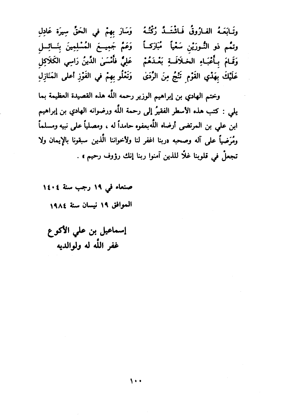 وختم الهادي بن إبراهيم الوزير رحمه الله هذه القصيدة العظيمة بما يلي: كتب هذه الأسطر الفقيرُ إلى رحمة الله ورضوانه الهادي بن إبراهيم ابن علي بن المرتضى أرضاه الله بعفوه حامداً له، ومصلياً على نبيه ومسلماً ومُرَضياً على آله وصحبه " ربنا اغفر لنا ولإخواننا الَّذين سبقونا بالإيمان ولا تجعلْ في قلوبنا غلاً للذين آمنوا ربنا إنك رؤوف رحيم ".