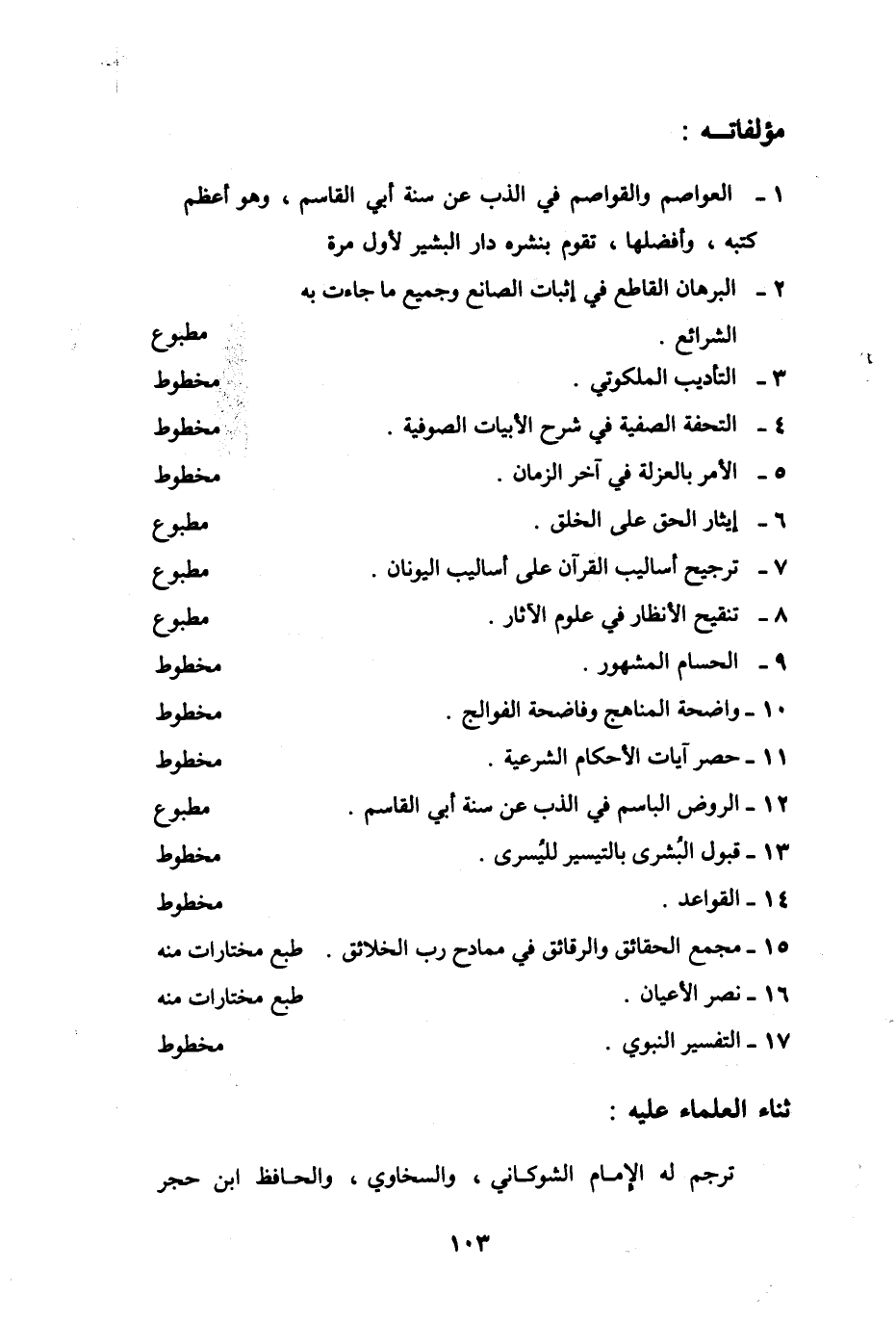 1 - العواصم والقواصم في الذب عن سنة أبي القاسم، وهو أعظم كتبه، وأفضلها، تقوم بنشره دار البشير لأول مرة.