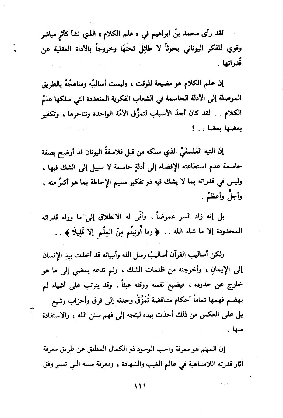 لقد رأى محمد بنُ إبراهيم في "علم الكلام" الذي نشأ كأثرٍ مباشر وقوي للفكر اليوناني بحوثاً لا طائِلَ تحتَهَا وخروجاً بالأداة العقلية عن قدراتها.