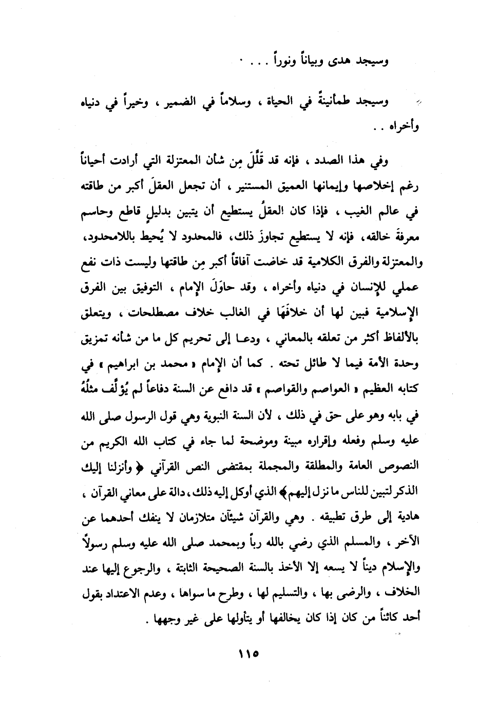 وفي هذا الصدد، فإنه قد قَلَّلَ مِن شأن المعتزلة التي أرادت أحياناً رغم إخلاصها وإيمانها العميق المستنير، أن تجعل العقلَ أكبر من طاقته في عالم الغيب، فإذا كان العقلُ يستطيع أن يتبين بدليلٍ قاطع وحاسم معرفة خالقه، فإنه لا يستطيع تجاوزَ ذلك، فالمحدود لا يُحيط باللامحدود، والمعتزلة والفرق الكلامية قد خاضت آفاقاً أكبر مِن طاقتها وليست ذات نفع عملي للإنسان في دنياه وأخراه، وقد حاوَلَ الإمام، التوفيق بين الفرق الإسلامية فبين لها أن خلافَهَا في الغالب خلاف مصطلحات، ويتعلق بالألفاظ أكثر من تعلقه بالمعاني، ودعا إلى تحريم كل ما من شأنه تمزيق وحدة الأمة فيما لا طائل تحته. كما أن الإمام " محمد بن إبراهيم " في كتابه العظيم " العواصم والقواصم " قد دافع عن السنة دفاعاً لم يُؤلِّف مثلُهُ في بابه وهو على حق في ذلك، لأن السنة النبوية وهي قول الرسول صلى الله عليه وسلم وفعله وإقراره مبينة وموضحة لما جاء في كتاب الله الكريم من النصوص العامة والمطلقة والمجملة بمقتضى النص القرآني {وأنزلنا إليك الذكر لتبين للناس ما نزل إليهم} الذي أوكل إليه ذلك، دالة على معاني القرآن، هادية إلى طرق تطبيقه. وهي والقرآن شيئآن متلازمان لا ينفك أحدهما عن الآخر، والمسلم الذي رضي بالله رباً وبمحمد صلى الله عليه وسلم رسولاً والإسلام ديناً لا يسعه إلا الأخذ بالسنة الصحيحة الثابتة، والرجوع إليها عند الخلاف، والرضى بها، والتسليم لها، وطرح ما سواها، وعدم الاعتداد بقول أحد كائناً من كان إذا كان يخالفها أو يتأولها على غير وجهها.