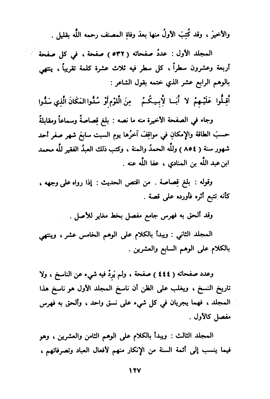 المجلد الأول: عددُ صفحاته (532) صفحة، في كل صفحة أربعة وعشرون سطراً، كل سطر فيه ثلاث عشرة كلمة تقريباًَ، ينتهي بالوهم الرابع عشر الذي ختمه بقول الشاعر: