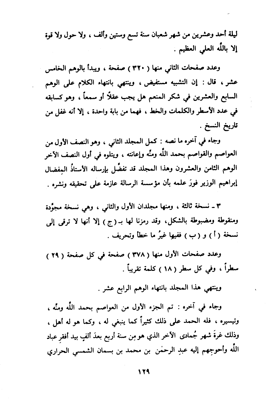 وجاء في آخره: تم الجزء الأول من العواصم بحمد الله ومنِّه، وتيسيره، فله الحمد على ذلك كثيراً كما ينبغي له، وكما هو له أهل، وذلك غرةَ شهر جُمادى الآخر الذي هو مِن سنة أربع بعدَ ألفٍ بيد أفقرِ عباد الله وأحوجِهم إليه عبدِ الرحمن بن محمد بن بسمان الشمسي الحراري