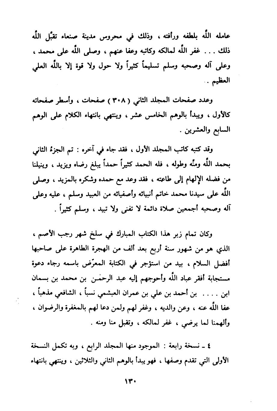 4 - نسخة رابعة: الموجود منها المجلد الرابع، وبه تكمل النسخة الأولى التي تقدم وصفها، فهو يبدأ بالوهم الثاني والثلاثين، وينتهي بانتهاء
