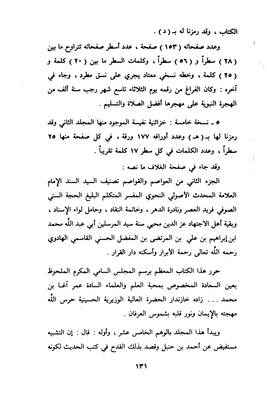 حرر هذا الكتاب المعظم برسم المجلس السامي المكرم الملحوظ بعين السعادة المخصوص بمحبة العلم والعلماء السادة عمر آغا بن محمد ... زاده خازندار الحضرة العالية الوزيرية الحسينية حرس الله مهجته بالإيمان ونور قلبه بشموس العرفان.