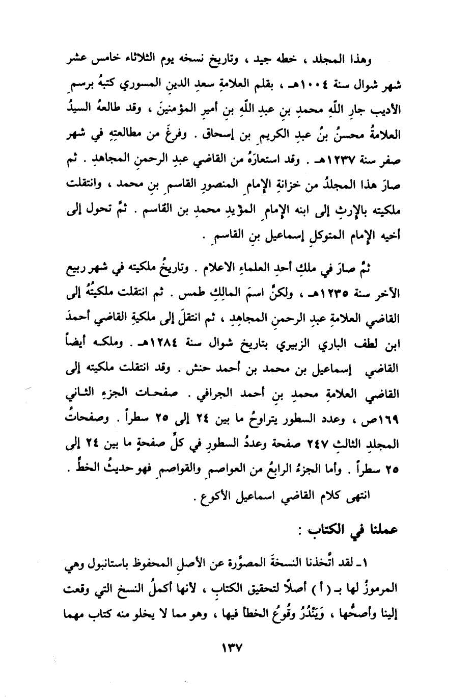 ثمَّ صارَ في ملكِ أحدِ العلماءِ الاعلام. وتاريخُ ملكيته في شهر ربيع الآخر سنة 1235 هـ، ولكنَّ اسمَ المالِكِ طمس. ثم انتقلت ملكليتُهُ إلى القاضي العلامةِ عبدِ الرحمنِ المجاهِدِ، ثم انتقلَ إلى ملكيةِ القاضي أحمدَ ابن لطف الباري الزبيري بتاريخ شوال سنة 1284 هـ. وملكه أيضاًً القاضي إسماعيل بن محمد بن أحمد حنش. وقد انتقلت ملكيته إلى القاضي العلامةِ محمدِ بنِ أحمد الجرافي. صفحات الجزءِ الثاني 169 ص، وعدد السطور يتراوحُ ما بين 24 إلى 25 سطراً. وصفحات المجلدِ الثالثِ 247 صفحة وعددُ السطور في كلِّ صفحةٍ ما بين 24 إلى 25 سطراً. وأما الجزءُ الرابع من العواصمِ والقواصمِ فهو حديثُ الخطِّ.