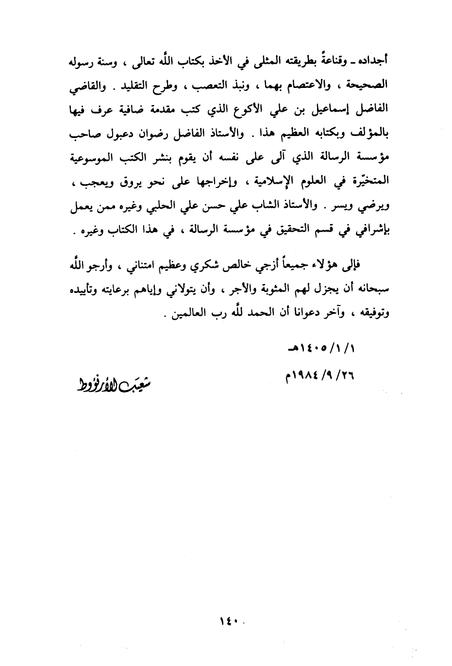أجداده- وقناعةً بطريقته المثلى في الأخذ بكتاب الله تعالى، وسنة رسوله الصحيحة، والاعتصام بهما، ونبذ التعصب، وطرح التقليد. والقاضي الفاضل إِسماعيل بن علي الأكوع الذي كتب مقدمة ضافية عرف فيها بالمؤلف وبكتابه العظيم هذا. والأستاذ الفاضل رضوان دعبول صاحب مؤسسة الوسالة الذي آلى على نفسه أن يقوم بنشر الكتب الموسوعية المتخيّرة في العلوم الإسلامية، وإخراجها على نحو يروق ويعجب، ويرضي ويسر. والأستاذ الشاب علي حسن علي الحلبي وغيره ممن يعمل بإشرافي في قسم التحقيق في مؤسسة الرسالة، في هذا الكتاب وغيره.