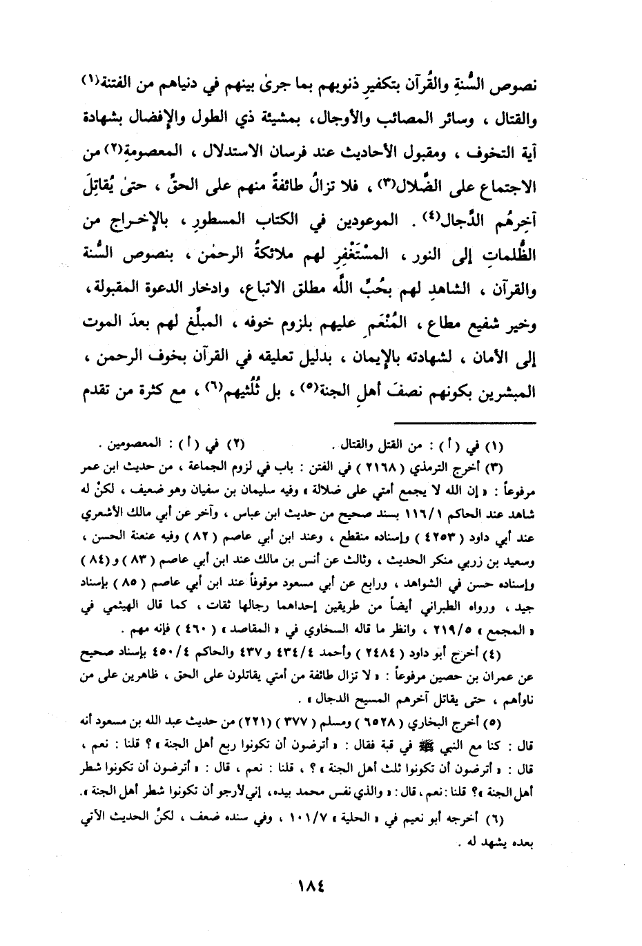 (¬4) أخرج أبو داود (2484) وأحمد 4/ 434 و437 والحاكم 4/ 450 بإسناد صحيح عن عمران بن حصين مرفوعاً: " لا تزال طائفة من أمتي يقاتلون على الحق، ظاهرين على من ناوأهم، حتى يقاتل آخرهم المسيح الدجال ".