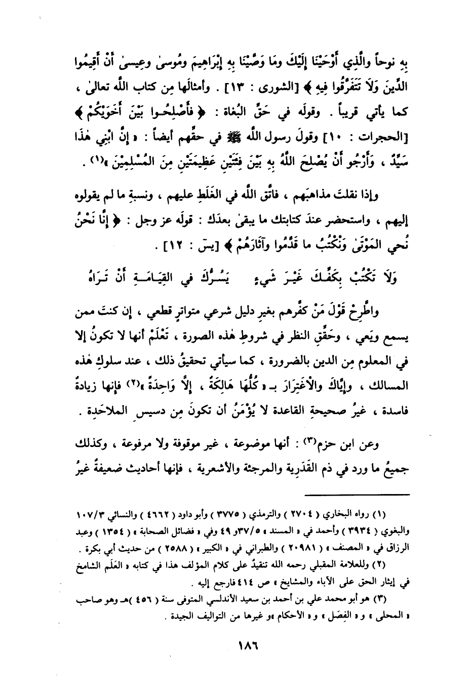 بِهِ نُوحًا وَالَّذِي أَوْحَيْنَا إِلَيْكَ وَمَا وَصَّيْنَا بِهِ إِبْرَاهِيمَ وَمُوسَى وَعِيسَى أَنْ أَقِيمُوا الدِّينَ وَلَا تَتَفَرَّقُوا فِيهِ} [الشورى: 13]. وأمثالَها مِن كتاب الله تعالى، كما يأتي قريباً. وقولَه في حَقِّ البُغاة: {فَأَصْلِحُوا بَيْنَ أَخَوَيْكُمْ} [الحجرات: 10] وقولَ رسول الله - صلى الله عليه وسلم - في حقِّهم أيضاًً: " إنَّ ابْنِي هذَا سَيِّدٌَ، وَأرْجُو أنْ يُصْلحَ اللهُ بهِ بَيْنَ فِئَتيْنِ عَظِيمَتيْنِ مِنَ المُسْلِمِيْنَ " (¬1).