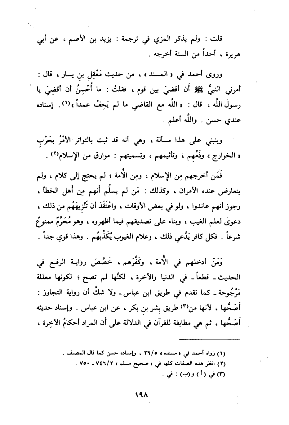 فَمَن أخرجهم مِن الإسلام، ومِن الأُمة؛ لم يحتج إلى كلام، ولم يتعارض عنده الأمران، وكذلك: من لم يسلِّم أنهم مِن أَهل الخطأ، وجوز أنهم عاندوا، ولو في بعض الأوقات، واعْتَقَدَ أن تنْزِيهَهُم من ذلك، دعوى لعلم الغيب، وبناء على تصديقهم فيما أظهروه، وهو مُحَرَّمٌ ممنوعٌ شرعاً. فكل كافر يَدَّعي ذلك، وعلام الغيوب يُكذِّبهُم. وهذا قوي جداً.