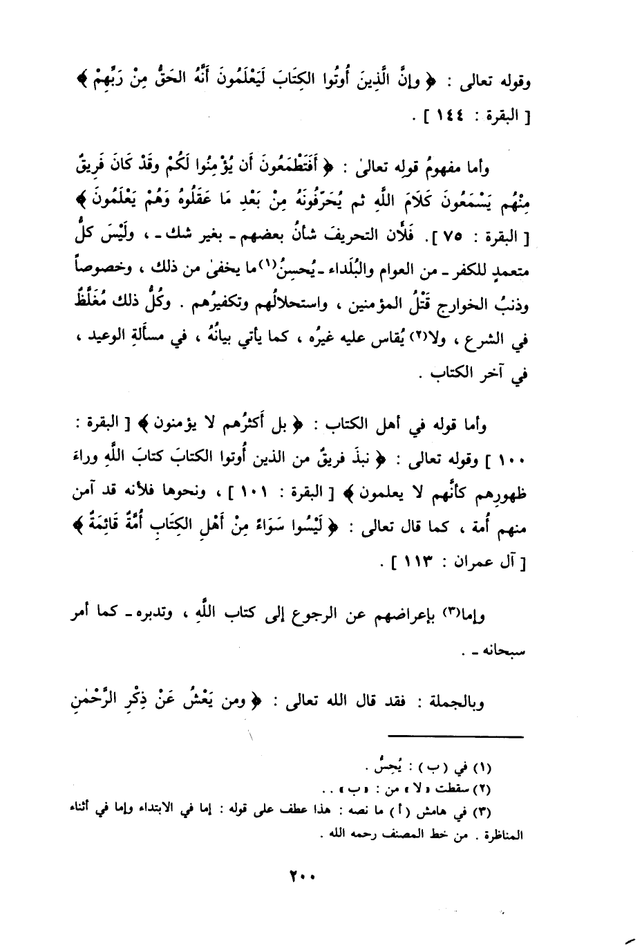 وأما قوله في أهل الكتاب: {بل أكثرُهم لا يؤمنون} [البقرة: 100] وقوله تعالى: {نبذ فريقٌ من الذين أُوتوا الكتاب كتاب اللهِ وراءَ ظهورِهم كأنَّهم لا يعلمون} [البقرة: 101]، ونحوها فلأنه قد آمن منهم أمة، كما قال تعالى: {لَيْسُوا سَوَاءً مِنْ أَهْلِ الكتَابِ أُمَّةٌ قَائِمَةٌ} [آل عمران: 113].
