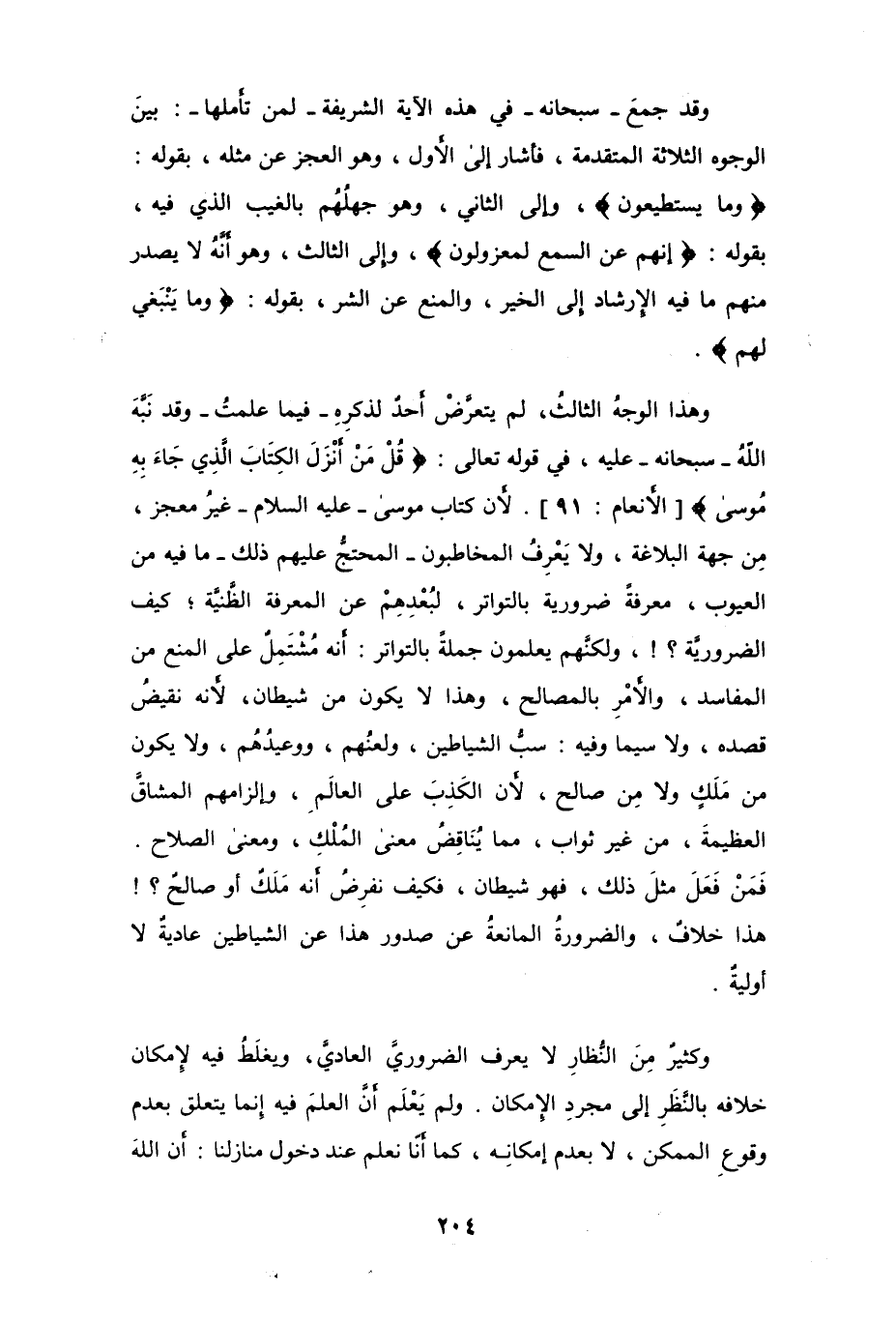 وهذا الوجهُ الثالث، لم يتعرَّضْ أحدٌ لذكره -فيما علمتُ- وقد نبَّهَ الله -سبحانه- عليه، في قوله تعالى: {قُلْ مَنْ أَنْزَلَ الْكِتَابَ الَّذِي جَاءَ بِهِ مُوسَى} [الأنعام: 91]. لأن كتاب موسى -عليه السلام- غيرُ معجز، من جهة البلاغة، ولا يَعْرفُ المخاطبون -المحتجُّ عليهم ذلك- ما فيه من العيوب، معرفةً ضرورية بالتواترت لبُعْدهِمْ عن المعرفة الظنيَّة؛ كيف الضرورية؟!، ولكنَّهم يعلمون جملةً بالتواتر: أنه مُشْتَملٌ على المنع من المفاسد، والأمْرِ بالمصالح، وهذا لا يكون من شيطان، لأنه نقيضٌ قصده، ولا سيما وفيه: سبٌّ الشياطين، ولعنهم، ووعيدُهُم، ولا يكون من ملكٍ ولا من صالح، لأن الكذِبَ على العالم، وإلزامهم المشاقِّ العظيمة، من غير ثواب، مما يُناقِضُ معنى المُلْكِ، ومعنى الصلاح.
