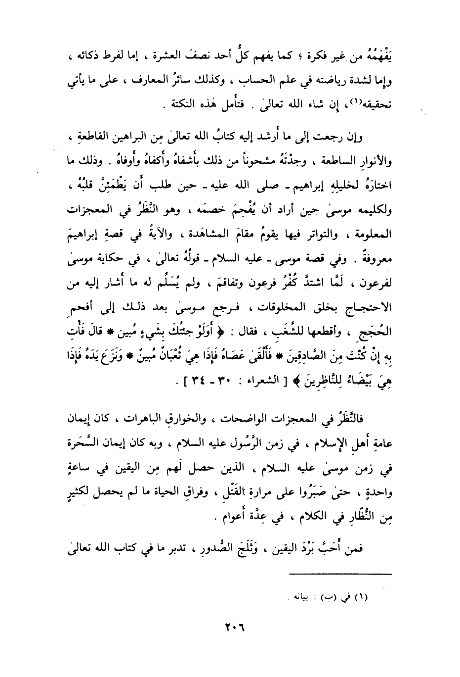 وان رجعت إلى ما أرشد إليه كتابُ الله تعالى مِن البراهين القاطعة، والأنوارِ الساطعة، وجدْتَهُ مشحوناً من ذلك بأشفاهُ وأكفاهُ وأوفاه. وذلك ما اختارهُ لخليلهِ إبراهيم -صلى الله عليه- حين طلب أن يَطْمَئنَ قلبُهُ، ولكليمه موسى حين أراد أن يُفْحِمَ خصمَه، وهو النَظرُ في المعجزات المعلومة، والتواتر فيها يقومُ مقامَ المشاهدة، والآيةُ في قصةِ إبراهيمَ معروفة. وفي قصة موسى -عليه السلام- قولهُ تعالى، في حكاية موسى لفرعون، لَما اشتدَّ كُفْرُ فرعون وتفاقمَ، ولم يُسَلِّم له ما أشار إليه من الاحتجاج بخلق المخلوقات، فرجع موسى بعد ذلك إلى أفحمِ الحُجَحِ، وأقطعها للشَّغَب، فقال: {أَوَلَوْ جِئْتُكَ بِشَيْءٍ مُبِينٍ (30) قَالَ فَأْتِ بِهِ إِنْ كُنْتَ مِنَ الصَّادِقِينَ (31) فَأَلْقَى عَصَاهُ فَإِذَا هِيَ ثُعْبَانٌ مُبِينٌ (32) وَنَزَعَ يَدَهُ فَإِذَا هِيَ بَيْضَاءُ لِلنَّاظِرِينَ} [الشعراء: 30 - 34].
