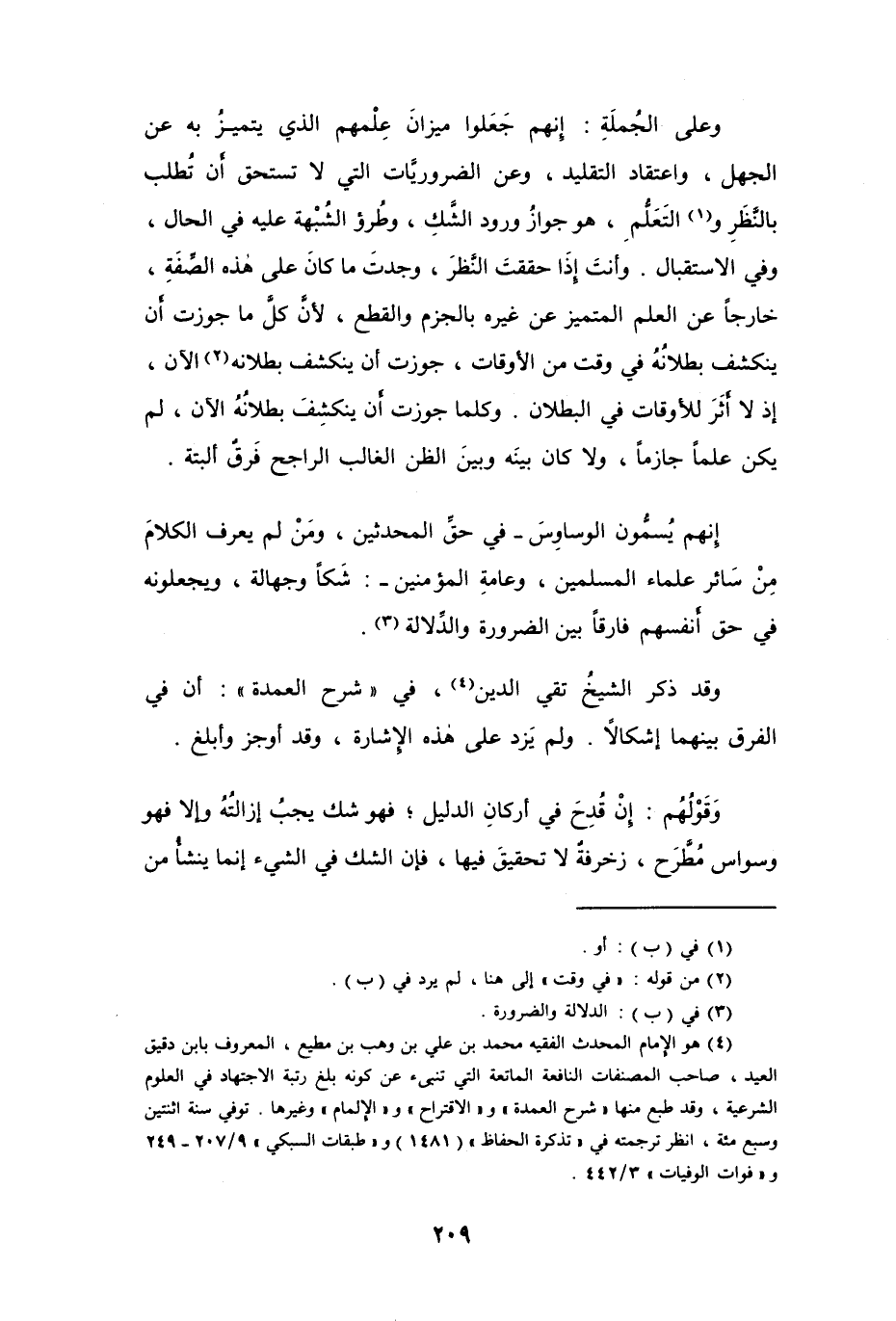 إنهم يُسمُّون الوساوِس -في حقِّ المحدثين، ومَنْ لم يعرف الكلام من سَائر علماء المسلمين، وعامةِ المؤمنين-: شَكاً وجهالة، ويجعلونه في حق أنفسهم فارقاً بين الضرورة والدِّلالة (¬3).
