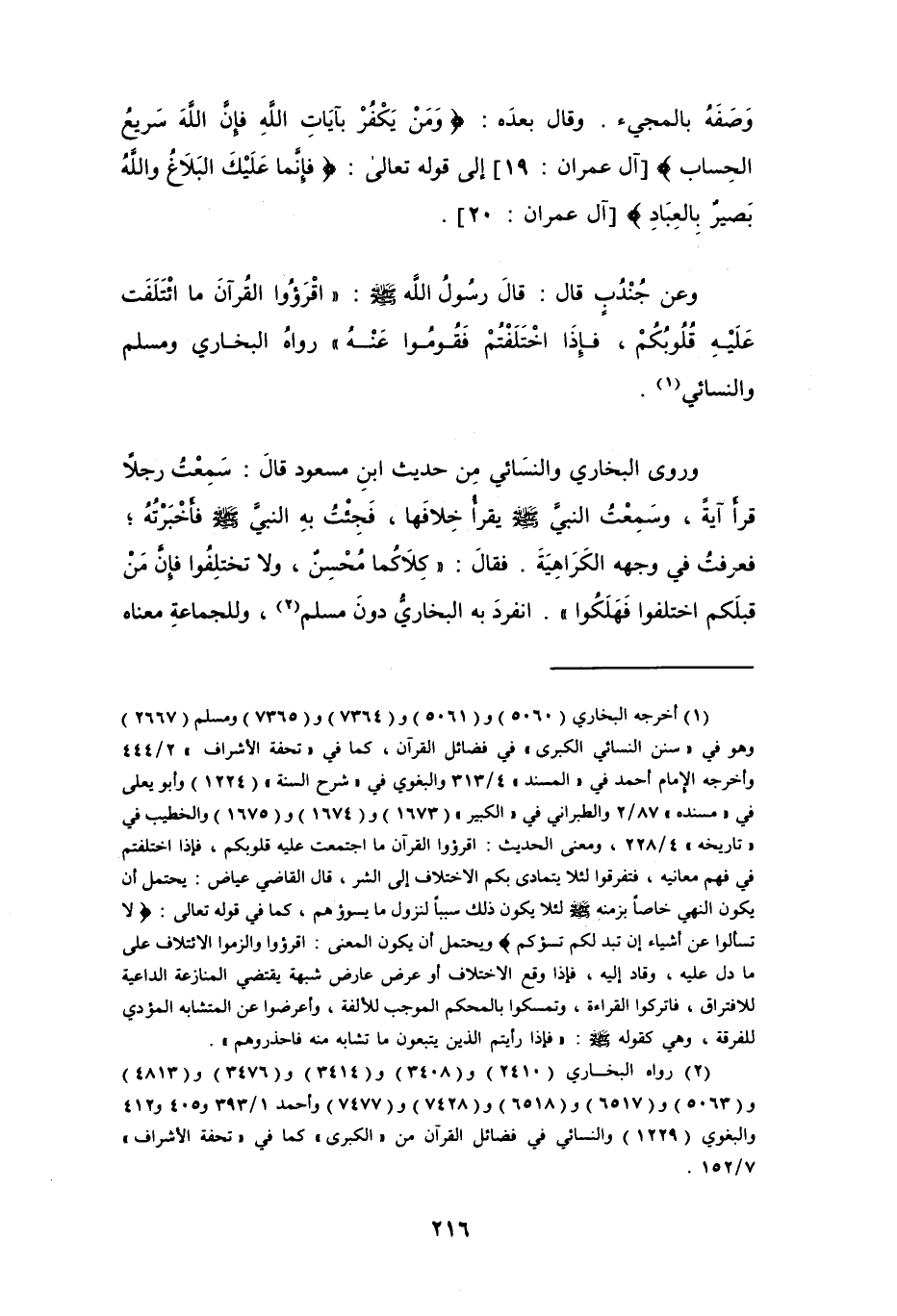 وروى البخاري والنسَائي من حديث ابنِ مسعود قالَ: سَمِعْتُ رجلاً قرأ آيةً، وسَمعْتُ النبي - صلى الله عليه وسلم - يقرأ خلافَها، فَجِئْتُ به النبي - صلى الله عليه وسلم - فأخبرتُهُ؛ فعرفت في وجهه الكراهيَة. فقال: " كِلاكُما مُحْسِن، ولا تختلِفوا فإنَّ مَنْ قبلَكم اختلفوا فهلَكُوا ". انفردَ به البخاريُّ دونَ مسلم (¬2)، وللجماعةِ معناه