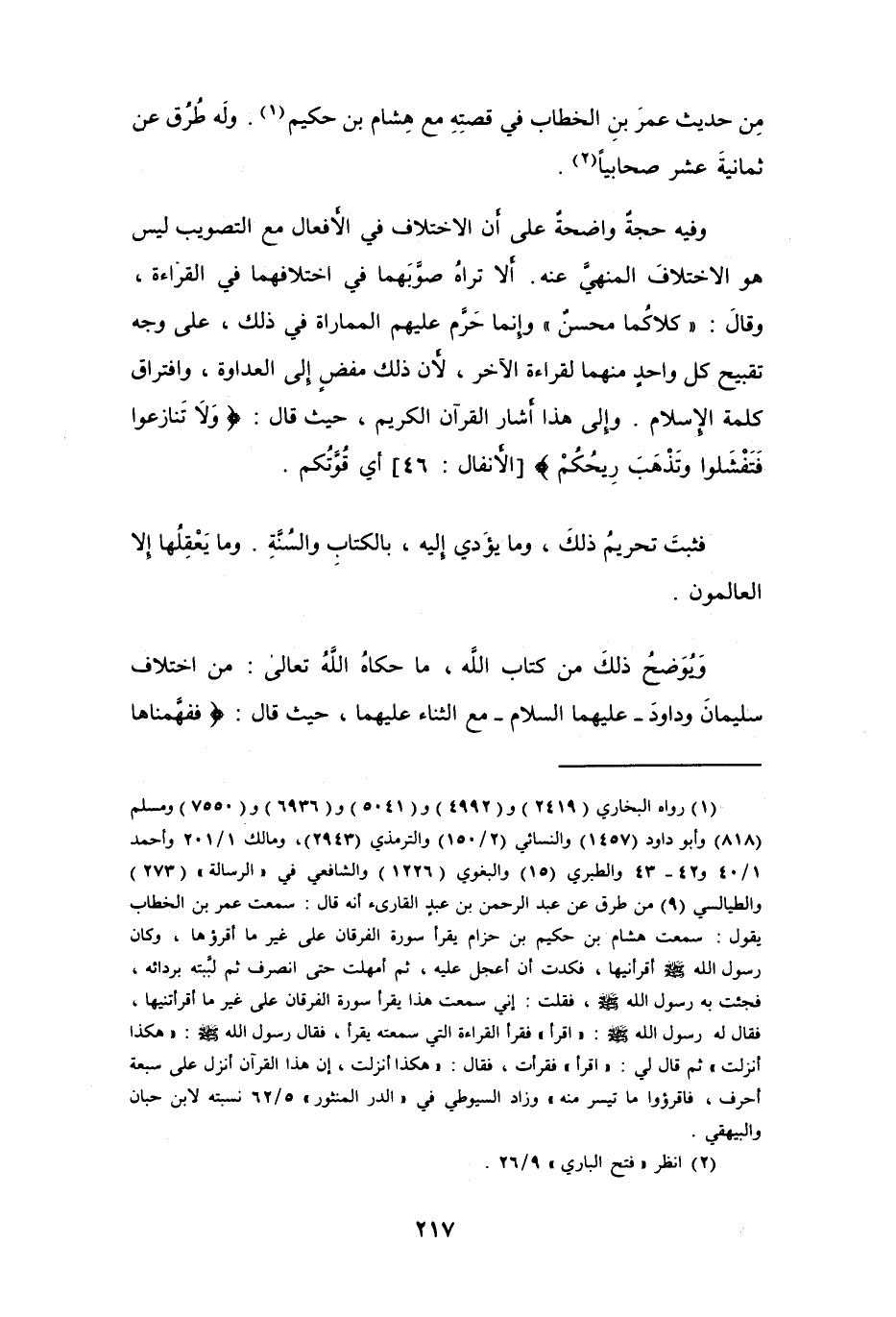 (¬1) رواه البخاري (2419) و (4992) و (5041) و (6936) و (7550) ومسلم (818) وأبو داود (1457) والنسائي (2/ 150) والترمذي (2943)، ومالك 1/ 201 وأحمد 1/ 40 و42 - 43 والطبري (15) والبغوي (1226) والشافعي في " الرسالة " (273) والطيالسي (9) من طرق عن عبد الرحمن بن عبد القارىء أنه قال: سمعت عمر بن الخطاب يقول: سمعت هشام بن حكيم بن حزام يقرأ سورة الفرقان على غير ما أقرؤها، وكان رسول الله - صلى الله عليه وسلم - أقرأنيها، فكدت أن أعجل عليه، ثم أمهلت حتى انصرف ثم لبَّبته بردائه، فجئت به رسوله الله - صلى الله عليه وسلم -، فقلت: إني سمعت هذا يقرأ سورة الفرقان على غير ما أقرأتنيها، فقال له رسول الله - صلى الله عليه وسلم - " أقرأ " فقرأ القراءة التي سمعته يقرأ، فقال رسول الله - صلى الله عليه وسلم -: " هكذا أنزلت " ثم قال لي: " اقرأ " فقرأت، فقال: " هكذا أنزلت، إن هذا القرآن أنزل على سبعة أحرف، فاقرؤوا ما تيسر منه " وزاد السيوطي في " الدر المنثور" 5/ 62 نسبته لابن حبان والبيهقي.
