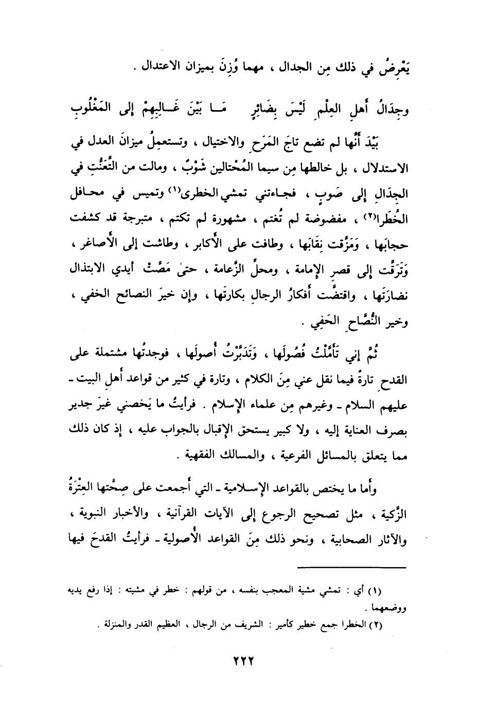 وأما ما يختص بالقواعد الإسلامية -التي أجمعت على صِحَّتها العِتْرةُ الزَّكية، مثل تصحيح الرجوع إلى الآيات القرآنية، والأخبار النبوية، والآثار الصحابية، ونحو ذلك منَ القواعد الأصولية -فرأيتُ القدحَ فيها