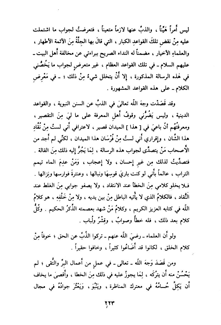 ليس أمراً هَيِّناً، والذبِّ عنها لازماً متعيناً، فتعرضتُ لجواب ما اشتملت عليه مِنْ نقضِ تلكَ القواعد الكبار، التي قالَ بها الجِلَّةُ مِنَ الأئمة الأطهار، والعلماءِ الأخيار، مضمناً له النداء الصريح ببراءتي عن مخالفة أهل البيت -عليهم السلام- في تلك القواعد العظام، غير متعرضٍ لجواب ما يَخُصُّني في هذه الرسالة المذكورة، إلا أنْ يتخلل شيءٌ مِنْ ذلك؛ -في معْرِضِ الكلام- على هذه القواعد المشهورة.