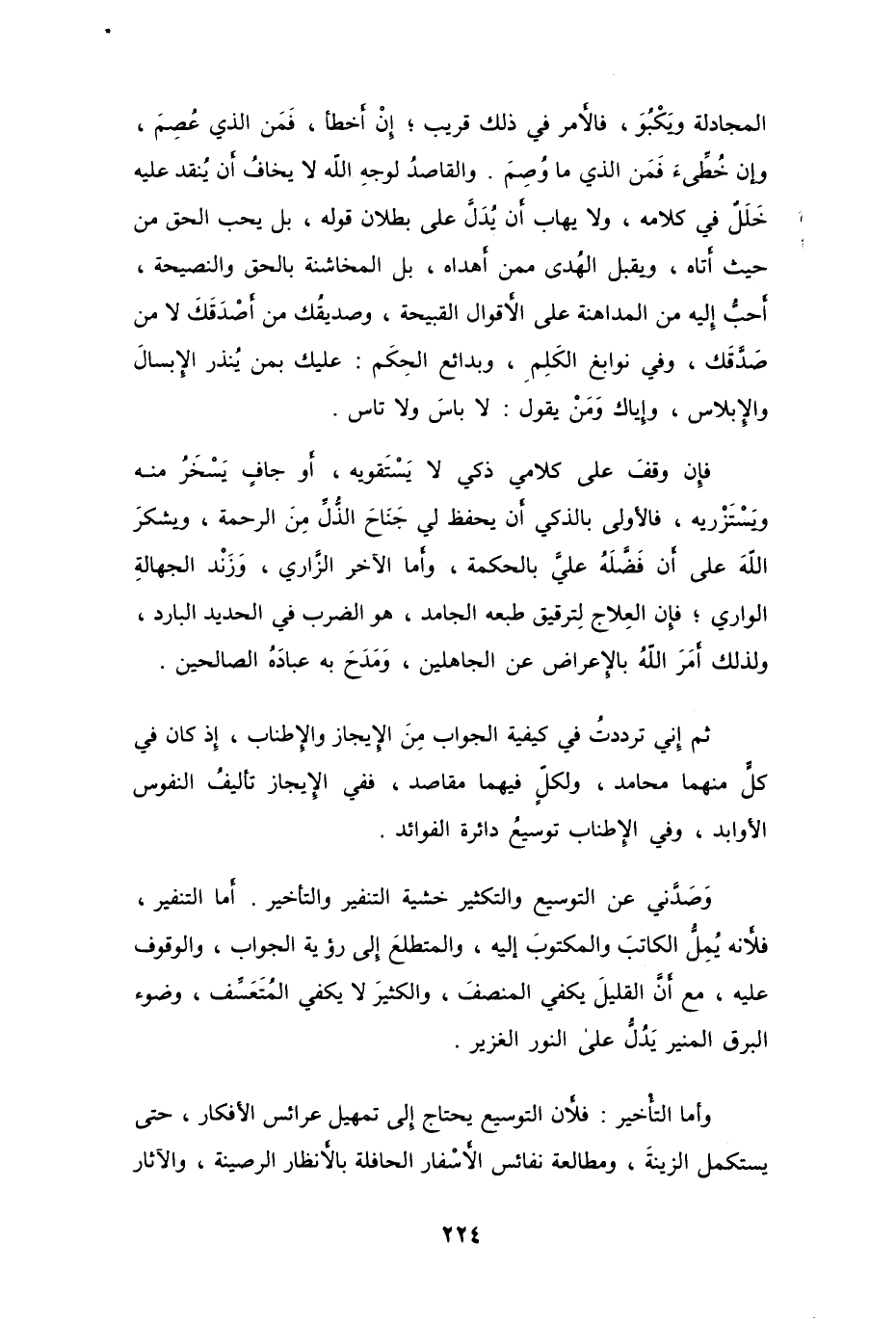 وصَدَّني عن التوسيع والتكثير خشية التنفير والتأخير. أما التنفير، فلأنه يُمِلُّ الكاتبَ والمكتوبَ إليه، والمتطلع إلى رؤية الجواب، والوقوف عليه، مع أنَّ القليل يكفي المنصفَ، والكثير لا يكفي المُتعَسِّف، وضوء البرق المنير يدُلُ على النور الغزير.