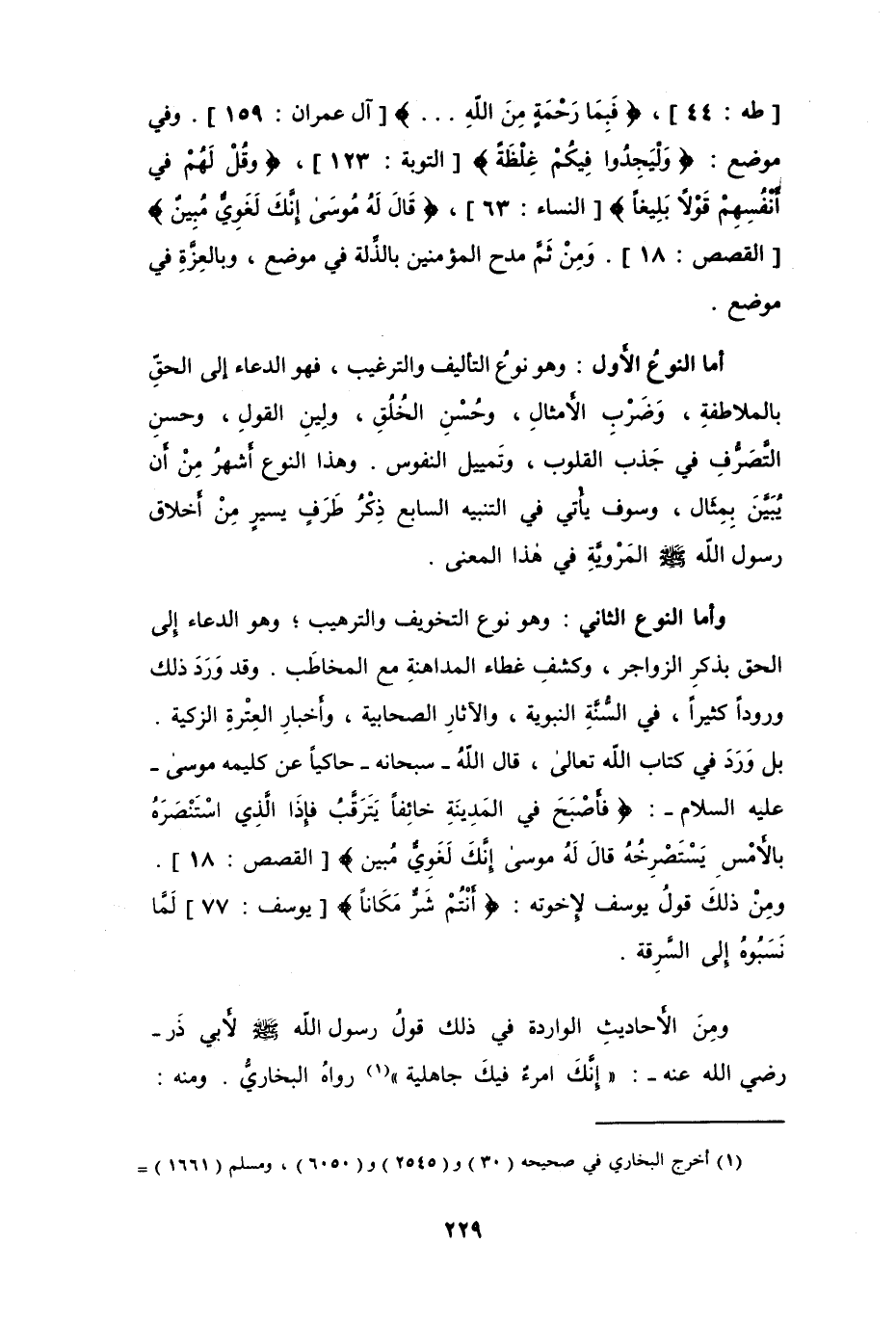 أما النوعُ الأول: وهو نوعُ التأليف والترغيب، فهو الدعاء إلى الحقِّ بالملاطفة، وَضرْبِ الأمثالِ، وحُسْن الخُلُقِ، ولِين القولِ، وحسنِ التَّصَرُّفِ في جَذب القلوب، وتَمييل النفوس. وهذا النوع أشهرُ مِنْ أن يُبَيَّنَ بِمثَال، وسوف يأتي في التنبيه السابع ذِكْرُ طرَفٍ يسيرٍ منْ أخلاق رسول الله - صلى الله عليه وسلم - المَرْويَّة في هذا المعنى.