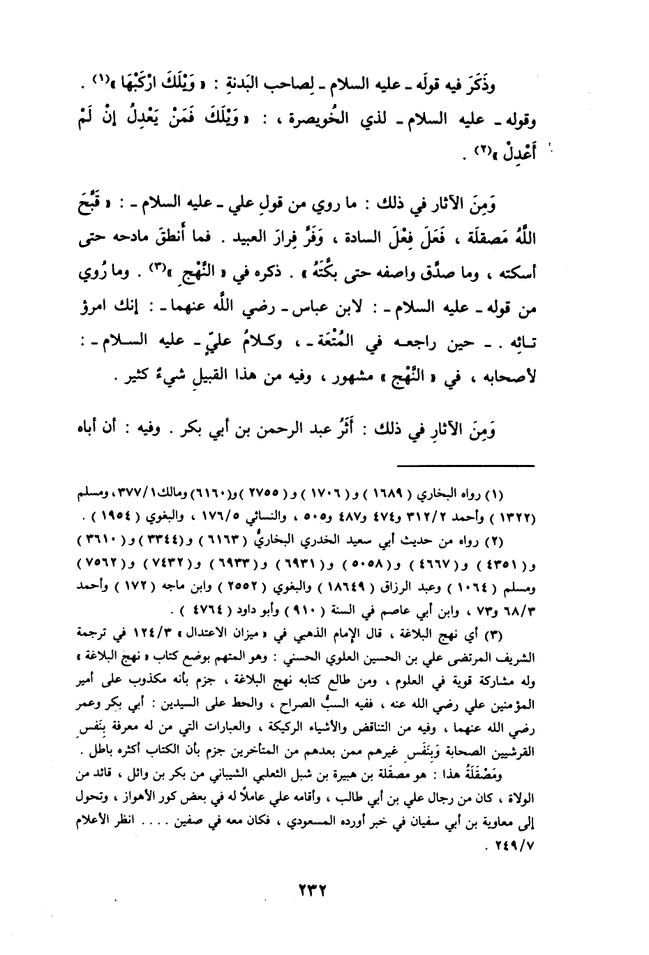 ومِنَ الآثار في ذلك: ما روي من قولِ علي -عليه السلام-: " قَبَّحَ اللهُ مَصقلة، فعَلَ فِعْلَ السادة، وَفرَّ فِرارَ العبيد. فما أنطقَ مادحه حتى أسكته، وما صدق واصفه حتى بكَّتَهُ ". ذكره في " النَّهْجِ " (¬3). وما رُوي من قوله -عليه السلام-: لابن عباس -رضي الله عنهما-: إنك امرؤ تائِه. -حين راجعه في المُتْعَة-، وكلامُ عليٍّ -عليه السلام-: لأصحابه، في " النَّهْج " مشهور، وفيه من هذا القبيلِ شيءٌ كثير.