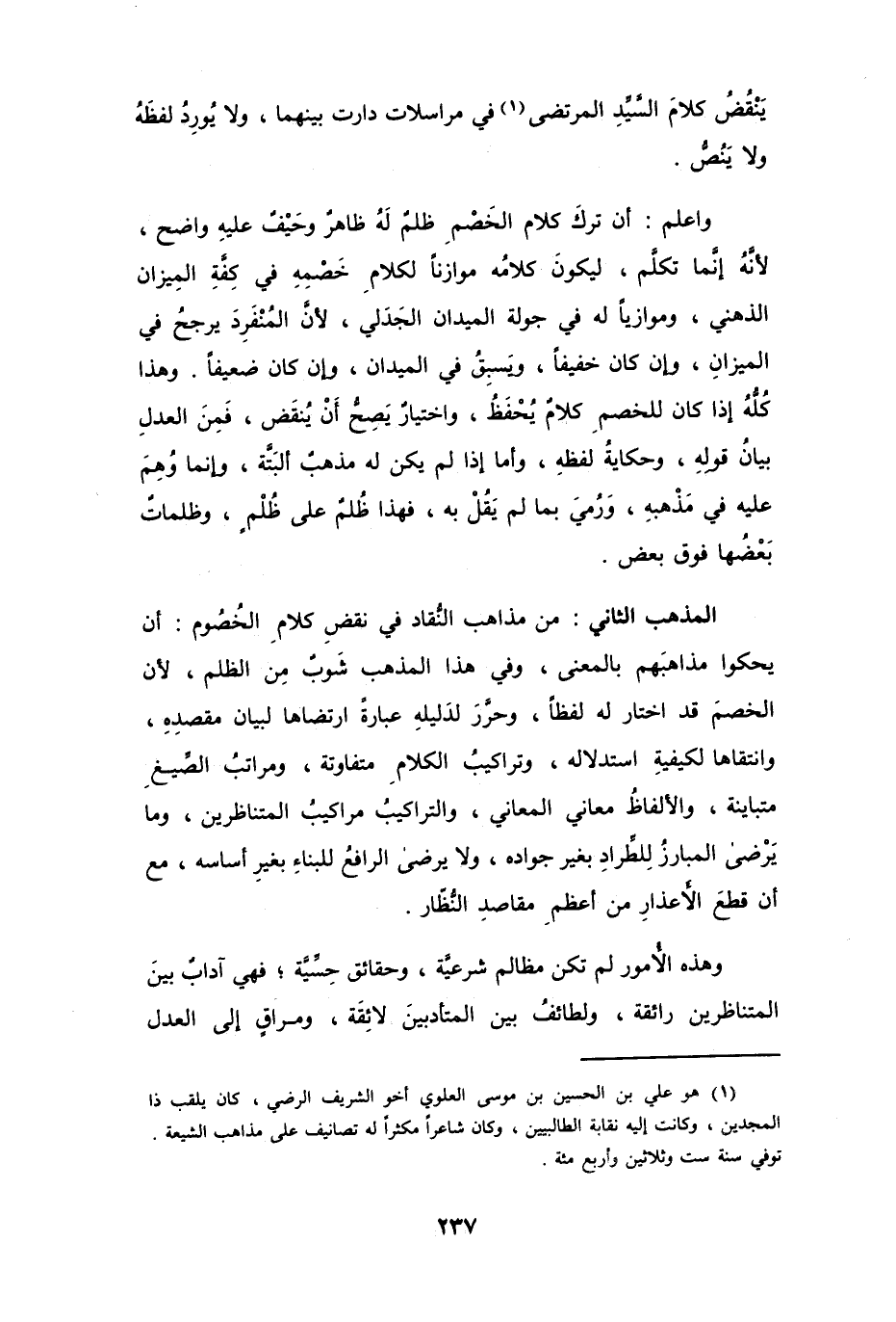 (¬1) هو علي بن الحسين بن موسى العلوي أخو الشريف الرضي، كان يلقب ذا المجدين، وكانت إليه نقابة الطالبيين، وكان شاعراً مكثراً له تصانيف على مذاهب الشيعة. توفي سنة ست وثلاثين وأربع مئة.