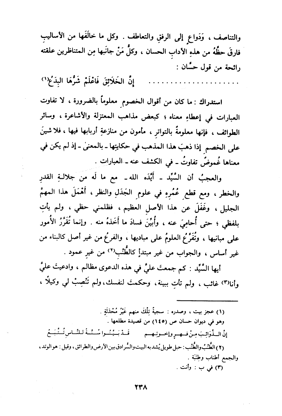 والتناصف، وَدَواعٍ إلى الرفقِ والتعاطف. وكل ما خالَفَها من الأساليبِ فارقَ حظَّهُ من هذه الآدابِ الحسان، وكلُّ منْ جانبها من المتناظرين علقته رائحة من قول حسَّان: