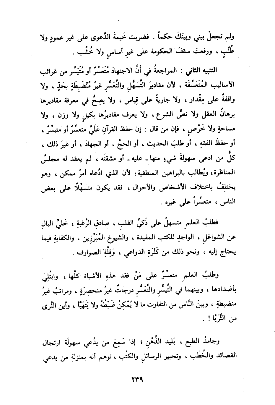 التنبيه الثاني: المراجعةُ في أنَّ الاجتهادَ مُتَعَسَرٌ أو مُتيَسِّر من غرائب الأساليب المُتَعَسِّفَة، لأن مقاديرَ التَّسَهُّلِ والتَّعَسُّر غيرُ مُنْضَبِطَةٍ بحَدٍّ، ولا واقفةٌ على مِقْدار، ولا جاريةٌ على قِياس، ولا يصحُّ في معرفة مقاديرها برهانُ العقل ولا نصُّ الشرع، ولا يعرف مقاديرُها بكيلٍ ولا وزن، ولا مساحةٍ ولا خَرْصٍ، فإن من قال: إن حفظ القرآنِ علَيَّ متعسِّرٌ أو متيسِّرٌ، أو حفظَ الفقه، أو طلبَ الحديث، أو الحجَّ، أو الجهاد، أو غيرَ ذلك، كلُّ من ادعى سهولةَ شيءٍ منها -عليه- أو مشقته، لم يعقد له مجلسُ المناظرة، ويُطالب بالبراهين المنطقية، لأن الذي ادَّعاه أمرٌ ممكن، وهو يختلِفُ باختلاف الأشخاص والأحوال، فقد يكون متسهِّلاً على بعض الناس، متعسِّراً على غيره.