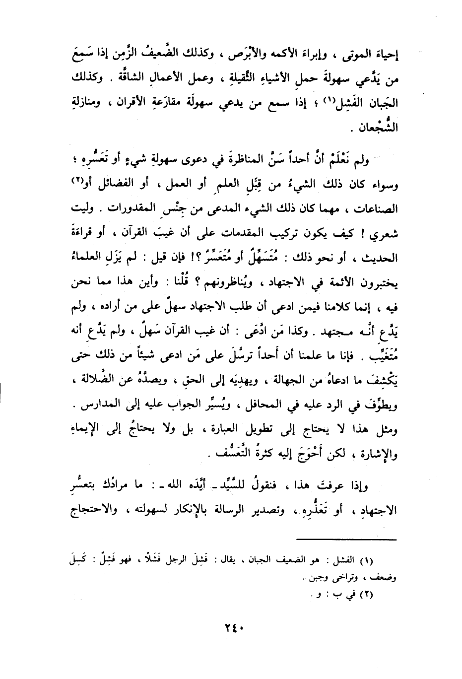 ولم نعْلَمْ أنَّ أحداً سَنَّ المناظرةَ في دعوى سهولة شيءٍ أو تَعسُّره؛ وسواء كان ذلك الشيء من قِبل العلمِ أو العمل، أو الفضائل أو (¬2) الصناعات، مهما كان ذلك الشيء المدعى من جِنْسِ المقدورات. وليت شعري! كيف يكون تركيب المقدمات على أن غيبَ القرآن، أو قراءَة الحديث، أو نحو ذلك: مُتَسَهِّلٌ أو مُتَعسِّرٌ؟! فإن قيل: لم يَزلِ العلماءُ يختبرون الأئمة في الاجتهاد، ويُناظرونهم؟ قُلنا: وأين هذا مما نحن فيه، إنما كلامنا فيمن ادعى أن طلب الاجتهاد سهلٌ على من أراده، ولم يَدَّعِ أنَّه مجتهد. وكذا مَن ادَّعى: أن غيب القرآن سهلٌ، ولم يَدَّعِ أنه مُتَغيِّب. فإنا ما علمنا أن أَحداً ترسَّل على من ادعى شيئاً من ذلك حتى يكشِف ما ادعاه من الجهالة، ويهديه إلى الحقِ، ويصدَّهُ عن الضَّلالة، ويطوِّفَ في الرد عليه في المحافل، وُيسيِّر الجواب عليه إلى المدارس.