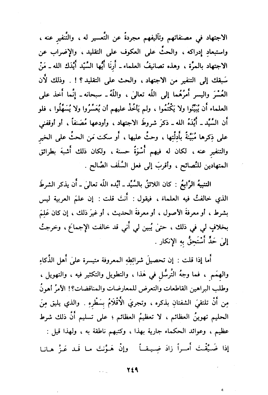 الاجتهاد في مصنفاتهم وتآليفهم مجردةً عن التَّعسير له، والتَّنفير عنه، واستبعادِ إدراكه، والحثِّ على العكوف على التقليد، والإضراب عن الاجتهاد بالمرَّة، وهذه تصانيفُ العلماء -أرنَا أيُّها السَّيِّد أيَّدَك الله- مَنْ سَبقك إلى التنفير من الاجتهاد، والحث على التقليد؟!. وذلك لأن العُسْرَ واليسر أمرُهُما إلى الله تعالى، واللهُ -سبحانه- إنما أخذ على العلماء أن يُبَيِّنُوا ولا يَكتُمُوا، ولم يَأخُذْ عليهم أن يُعسِّرُوا ولا يُسَهِّلُوا، فلو أن السَّيِّد -أيَّدهُ الله- ذكرَ شروط الاجتهاد، وأودعها مُصَنفاً، أو أوقفني على ذكرها مُبيَّنةً بأدِلتِها، وحثَّ عليها، أو سكت مَن الحثِّ على الخير والتنفيرِ عنه، لكان له فيهم أُسْوَةٌ حسنة، ولكان ذلك أشبة بطرائق المتهادين للنَّصائح، وأقربَ إلى فعل السَّلَف الصَّالح.