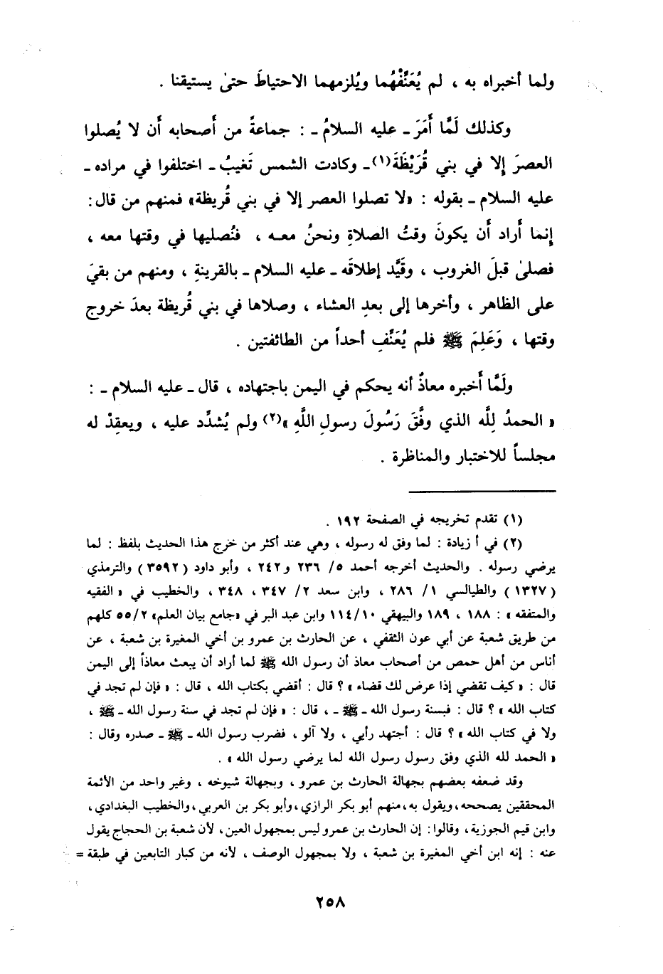 (¬2) في أزيادة: لما وفق له رسوله، وهي عند أكثر من خرج هذا الحديث بلفظ: لما يرضي رسوله. والحديث أخرجه أحمد 5/ 236 و242، وأبو داود (3592) والترمذي (1327) والطيالسي 1/ 286، وابن سعد 2/ 347، 348، والخطيب في " الفقيه والمتفقه ": 188، 189 والبيهقي 10/ 114 وابن عبد البر في " جامع بيان العلم " 2/ 55 كلهم من طريق شعبة عن أبي عون الثقفي، عن الحارث بن عمرو بن أخي المغيرة بن شعبة، عن أناس من أهل حمص من أصحاب معاذ أن رسول الله - صلى الله عليه وسلم - لما أراد أن يبعث معاذاً إلى اليمن قال: " كيف تقضي إذا عرض لك قضاء "؟ قال: أقضي بكتاب الله، قال: " فإن لم تجد في كتاب الله "؟ قال: فبسنة رسول الله - صلى الله عليه وسلم -، قال: " فإن لم تجد في سنة رسول الله - صلى الله عليه وسلم -، ولا في كتاب الله "؟ قال: اجتهد رأيي، ولا آلو، فضرب رسول الله - صلى الله عليه وسلم - صدره وقال: " الحمد لله الذي وفق رسول رسول الله لما يرضي رسول الله ".