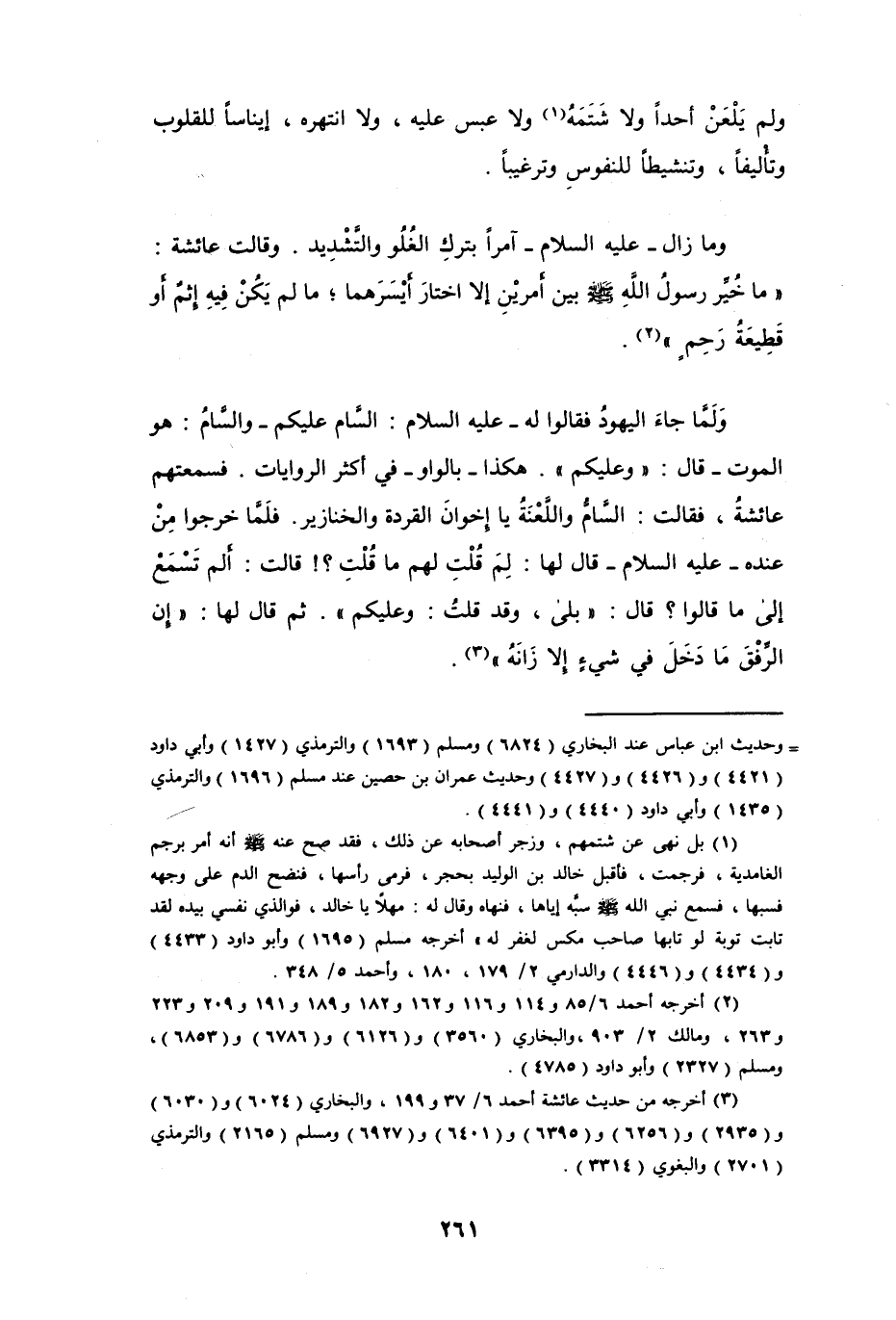 وَلَمَّا جاءَ اليهودُ فقالوا له -عليه السلام-: السَّام عليكم -والسَّامُ: هو الموت- قال: " وعليكم ". هكذا -بالواو- في أكثر الروايات. فسمعتهم عائشة، فقالت: السَّام واللَّعْنةُ يا إخوان القردة والخنازير. فلَمَّا خرجوا منْ عنده -عليه السلام- قال لها: لمَ قُلْتِ لهم ما قُلْتِ؟! قالت: أَلم تَسْمَعْ إلى ما قالوا؟ قال: " بلى، وقد قلتُ: وعليكم ". ثم قال لها: " إن الرِّفْقَ مَا دَخَلَ في شيءٍ إلا زَانَهُ " (¬3).