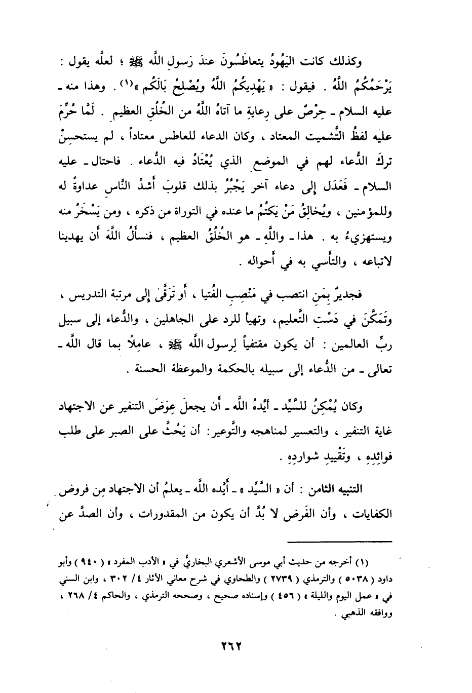 وكذلك كانت اليهُودُ يتعاطَسُونَ عند رَسولِ الله - صلى الله عليه وسلم -، لعلَّه يقول: يَرْحَمُكمُ اللهُ. فيقول: " يَهْدِيكُمُ الله ويُصْلحُ بَالَكُم " (¬1). وهذا منه -عليه السلام- حِرْصٌ على رِعايةِ ما آتاهُ اللهُ من الخُلُقِ العظيمِ، لَما حُرِّمَ عليه لفظُ التَّشميت المعتاد، وكان الدعاء للعاطس معتاداً، لم يستحسِنْ ترك الدُّعاء لهم في الموضعِ الذي يُعْتَادُ فيه الدُّعاء. فاحتال -عليه السلام- فَعَدَل إلى دعاء آخر يَجْبُرُ بذلك قلوبَ أشدَّ النَّاس عداوةً له وللمؤمنين، ويُخالِقُ مَنْ يَكتُمُ ما عنده في التوراة من ذكره، ومن يَسْخَرُ منه ويستهزيءُ به. هذا -والله- هو الخُلُقُ العظيم، فنسألُ الله أن يهدينا لاتباعه، والتأسي به في أحواله.