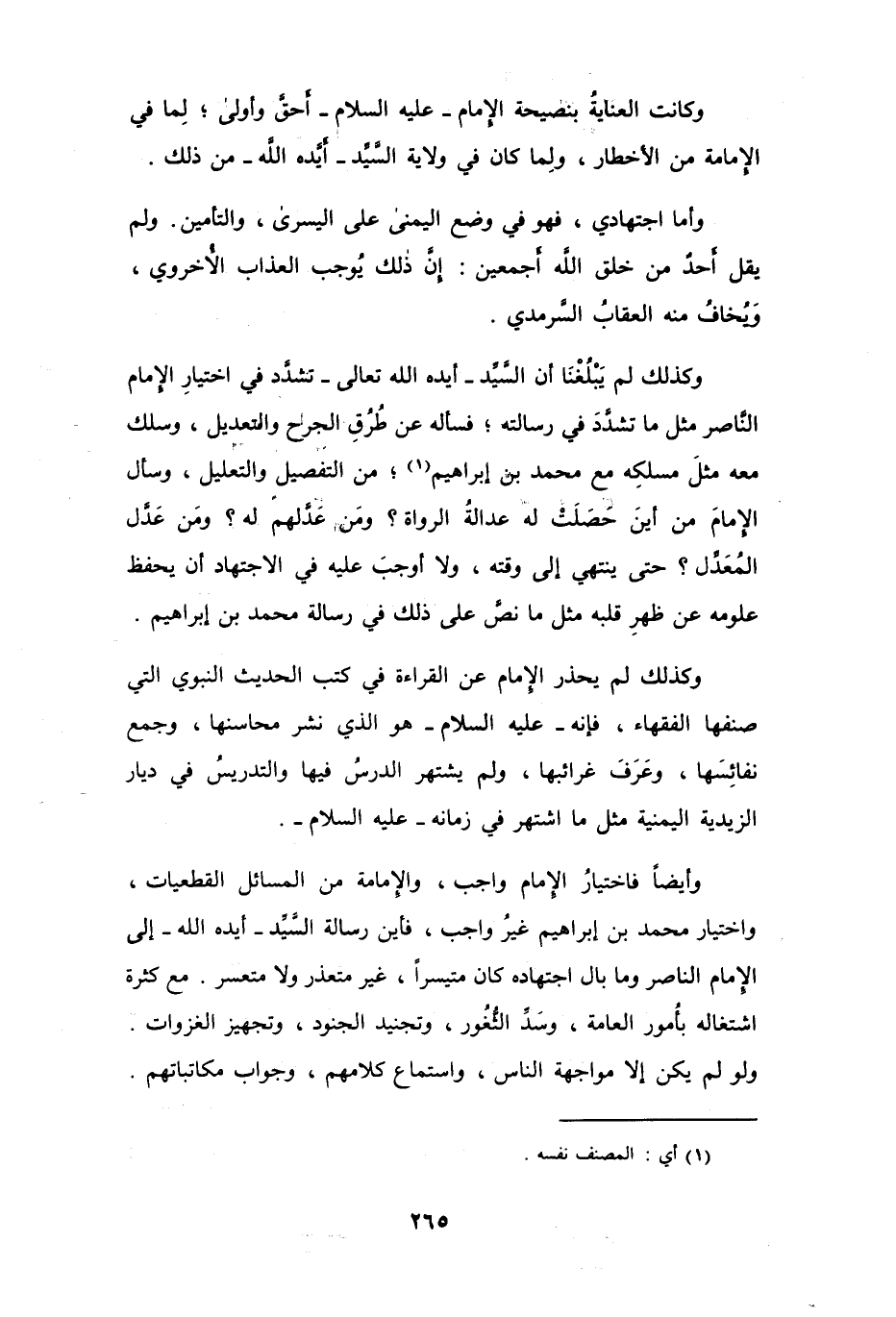 وأيضاً فاختيارُ الإمام واجب، والإمامة من المسائل القطعيات، واختيار محمد بن إبراهيم غيرُ واجب، فأين رسالة السَّيِّد -أيده الله- إلى الإمام الناصر وما بال اجتهاده كان ميسراً، غير متعذر ولا متعسر. مع كثرة اشتغاله بأُمور العامة، وسَدَّ الثُّغُور، وتجنيد الجنود، وتجهيز الغزوات. ولو لم يكن إلا مواجهة الناس، واستماع كلامهم، وجواب مكاتباتهم.