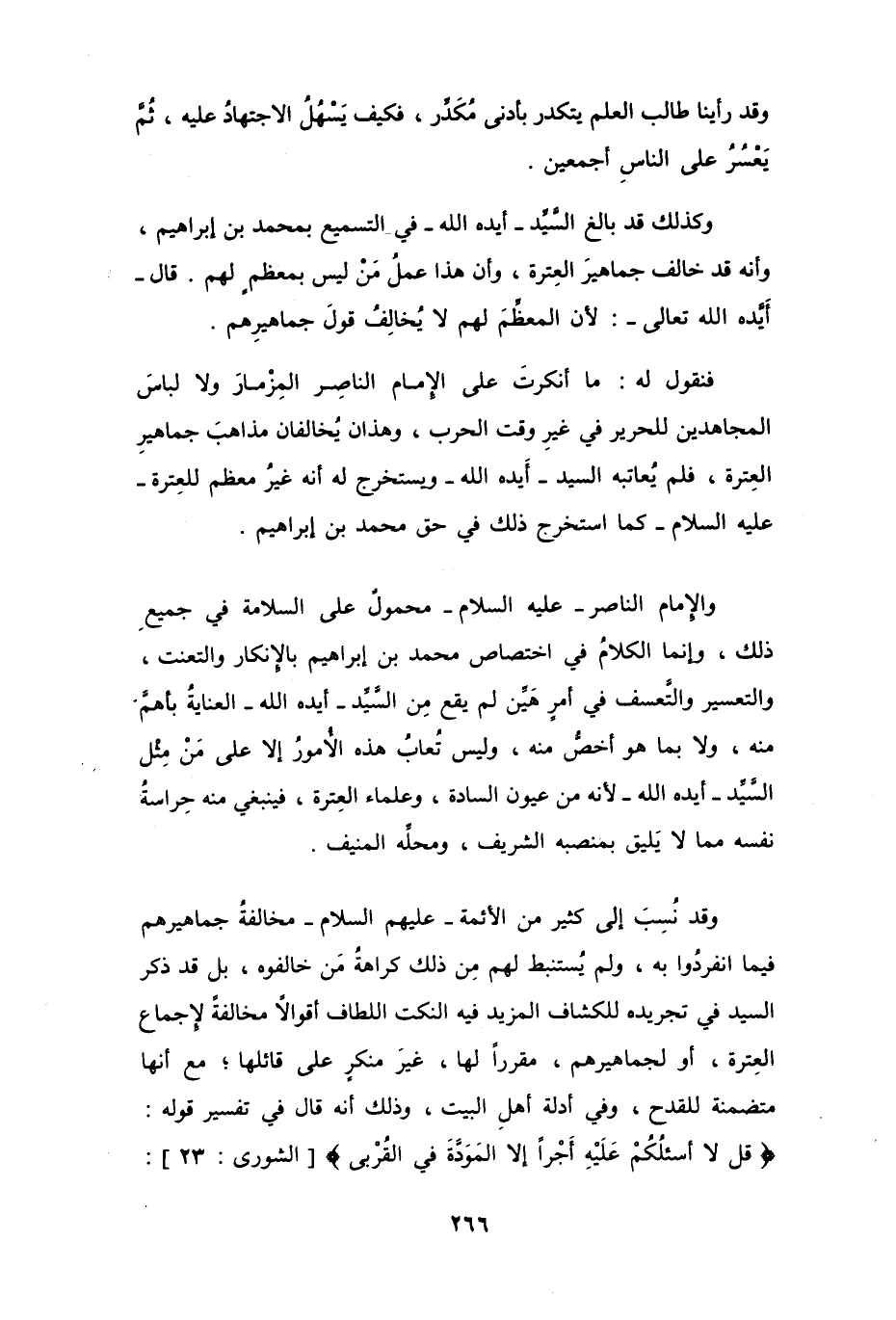 وقد نُسِبَ إلى كثير من الأئمة -عليهم السلام- مخالفةُ جماهيرهم فيما انفردُوا به، ولم يُستنبط لهم من ذلك كراهةُ مَن خالفوه، بل قد ذكر السيد في تجريده للكشاف المزيد فيه النكت اللطاف أقوالاً مخالفةً لإجماع العِترة، أو لجماهيرهم، مقرراً لها، غيرَ منكرٍ على قائلها؛ مع أنها متضمنة للقدح، وفي أدلة أهلِ البيت، وذلك أنه قال في تفسير قوله: {قل لا أسئلُكُمْ عَلَيْهِ أَجْراً إلا المَودَّةَ في القُرْبى} [الشورى: 23]: