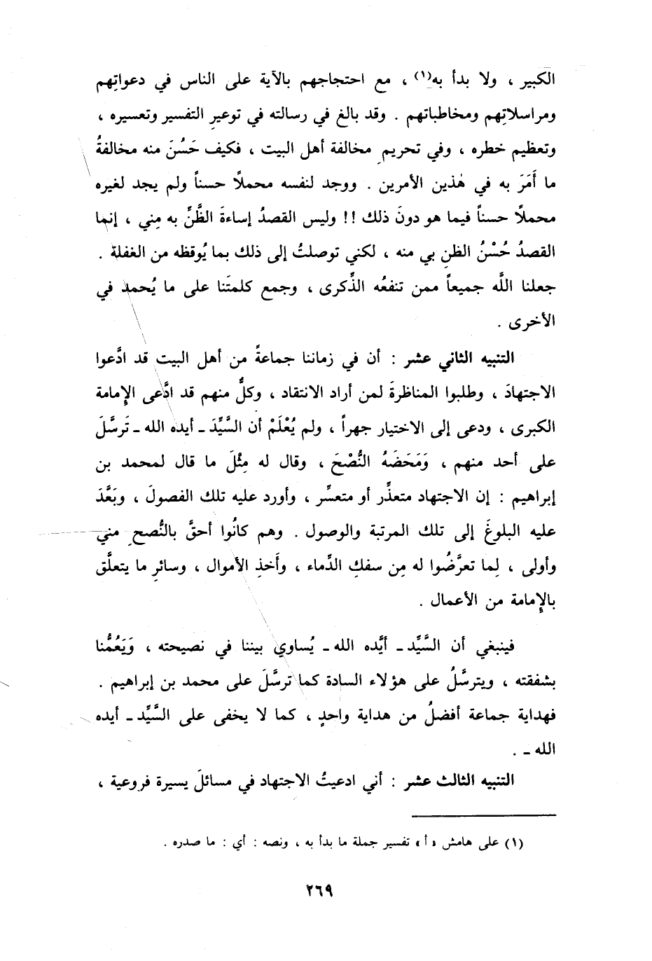 التنبيه الثاني عشر: أن في زماننا جماعةً من أهل البيت قد ادَّعوا الاجتهادَ، وطلبوا المناظرةَ لمن أراد الانتقاد، وكلُّ منهم قد ادَّعى الإمامة الكبرى، ودعى إلى الاختيار جهراً، ولم يُعْلَمْ أن السَّيِّدَ -أيده الله- تَرسَّلَ على أحد منهم، ومَحَضَه النُّصْحَ، وقال له مِثْلَ ما قال لمحمد بن إبراهيم: إن الاجتهاد متعذِّر أو متعسِّر، وأورد عليه تلك الفصولَ، وبَعَّدَ عليه البلوغَ إلى تلك المرتبة والوصول. وهم كانُوا أحقَّ بالنُّصحِ مني وأولى، لِما تعرَّضوا له مِن سفكِ الدِّماء، وأخذِ الأموال، وسائرِ ما يتعلَّق بالإمامة من الأعمال.