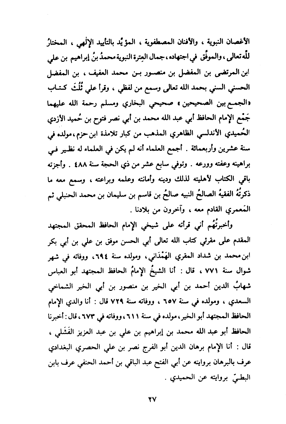 وأخبرتُهُم أني قرأته على شيخي الإمام الحافظ المحقق المجتهد المقدم على مقرئي كتاب الله تعالى أبي الحسن موفق بن علي بن أبي بكر ابن محمد بن شداد المقري الهَمْدَاني، ومولده سنة 694، ووفاته في شهر شوال سنة 771، قال: أنا الشيخُ الإمامُ الحافظ المجتهد أبو العباس شهابُ الدين أحمد بن أبي الخير بن منصور بن أبي الخير الشماخي السعدي، ومولده في سنة 657، ووفاته سنة 729 قال: أنا والدي الإمام الحافظ المجتهد أبو الخير، مولده في سنة 611، ووفاته في 673، قال: أخبرنا الحافظ أبو عبد الله محمد بن إبراهيم بن علي بن عبد العزيز الفَشَلي، قال: أنا الإمام برهان الدين أبو الفرج نصر بن علي الحصري البغدادي عرف بالبرهان بروايته عن أبي الفتح عبد الباقي بن أحمد الحنفي عرف بابن البطيّ بروايته عن الحميدي.