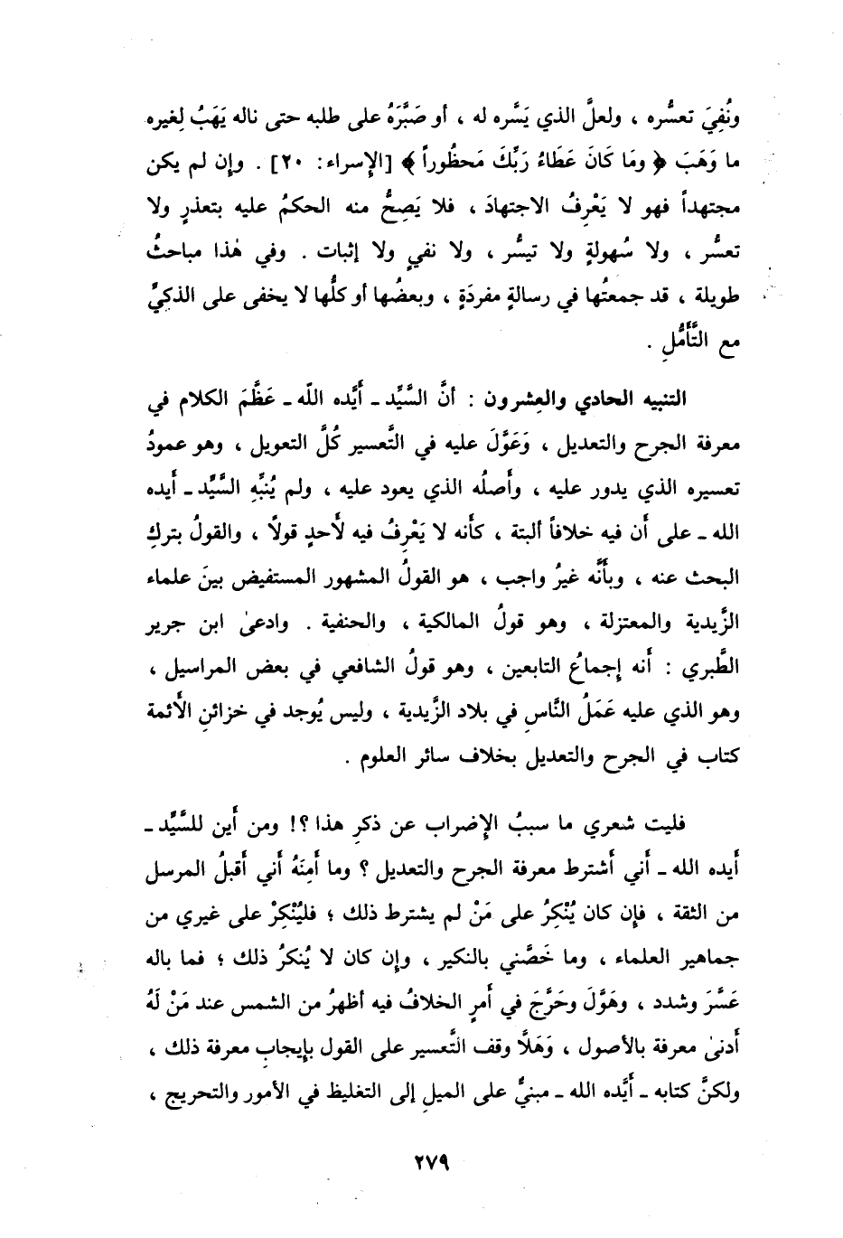 التنبيه الحادي والعِشرين: أنَّ السَّيِّد -أيَّده الله- عَظَّمَ الكلام في معرفة الجرح والتعديل، وعَوَّل عليه في التَّعسير كُلَّ التعويل، وهو عمودُ تعسيره الدي يدور عليه، وأصلُه الذي يعود عليه، ولم يُنبِّهِ السَّيِّد -أيده الله- على أن فيه خلافاً ألبتة، كأنه لا يَعْرِفُ فيه لأحدٍ قولاً، والقولُ بتركِ البحث عنه، وبأنَّه غيرُ واجب، هو القولُ المشهور المستفيض بينَ علماء الزَّيدية والمعتزلة، وهو قولُ المالكية، والحنفية. وادعى ابن جرير الطَّبري. أنه إجماعُ التابعين، وهو قول الشافعي في بعض المراسيل، وهو الذي عليه عَمَلُ النَّاسِ في بلاد الزَّيدية، وليس يُوجد في خزائنِ الأئمة كتاب في الجرح والتعديل بخلاف سائر العلوم.