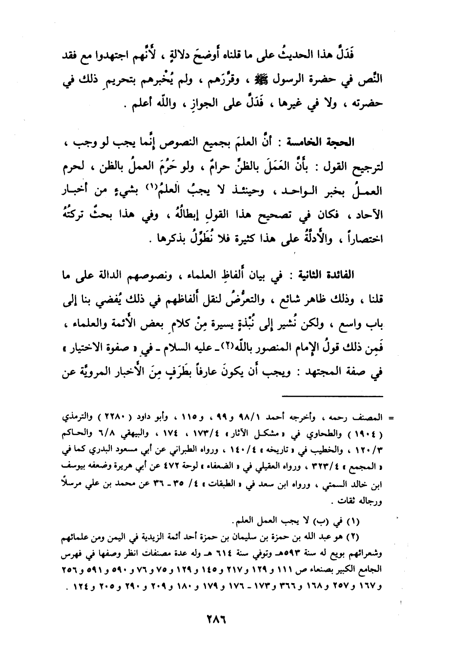 الفائدة الثانية: في بيان ألفاظِ العلماء، ونصوصهم الدالة على ما قلنا، وذلك ظاهر شائع، والتعرُّضُ لنقل ألفاظهم في ذلك يُفضي بنا إلى باب واسع، ولكن نُشير إلى نُبْذةٍ يسيرة مِنْ كلامِ بعض الأئمة والعلماء، فَمِن ذلك قولُ الإمام المنصور بالله (¬2) -عليه السلام- في " صفوة الاختيار " في صفة المجتهد: ويجب أن يكونَ عارفاً بطرَفٍ مِن الأخبار المرويِّة عن