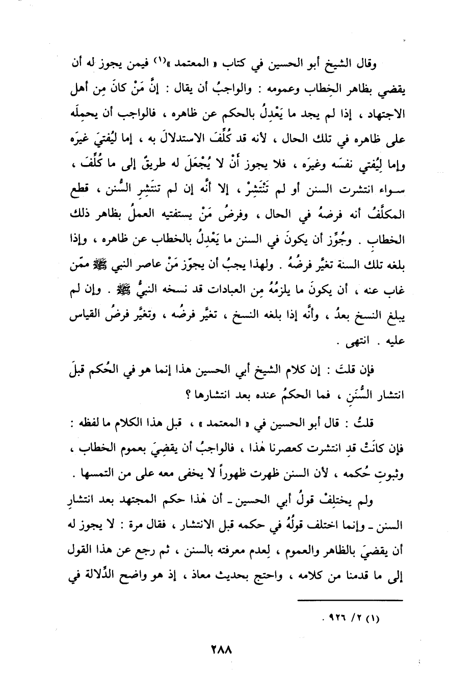 وقال الشيخ أبو الحسين في كتاب " المعتمد " (¬1) فيمن يجوز له أن يقضي بظاهر الخِطاب وعمومه: والواجبُ أن يقال: إنَّ منْ كان مِن أهل الاجتهاد، إذا لم يجد ما يَعْدِلُ بالحكم عن ظاهره، فالواجب أن يحمِلَه على ظاهره في تلك الحال، لأنه قد كُلِّفَ الاستدلالَ به، إما ليُفتيَ غيرَه وإما لِيُفتي نفسَه وغيرَه، فلا يجوز أنْ لا يُجْعَلَ له طريقُ إلى ما كُلِّفَ، سواء انتشرت السنن أو لم تنْتَشِرْ، إلا أنَّه إن لم تنتَشِرِ السُّنن، قطع المكلَّفُ أنه فرضهُ في الحال، وفرضُ مَنْ يستفتيه العملُ بظاهر ذلك الخطابِ. وجُوَّز أن يكونَ في السنن ما يعْدِلُ بالخطاب عن ظاهره، وإذا بلغه تلك السنة تغيَّر فرضُهُ. ولهذا يجبُ أن يجوز منْ عاصر النبي - صلى الله عليه وسلم - ممَّن غاب عنه، أن يكونَ ما يلزمُهُ مِن العبادات قد نسخه النبي - صلى الله عليه وسلم -. وإن لم يبلغ النسخ بعدُ، وأنَّه إذا بلغه النسخ، تغيَّر فرضُه، وتغيَّر فرضُ القياس عليه. انتهى.