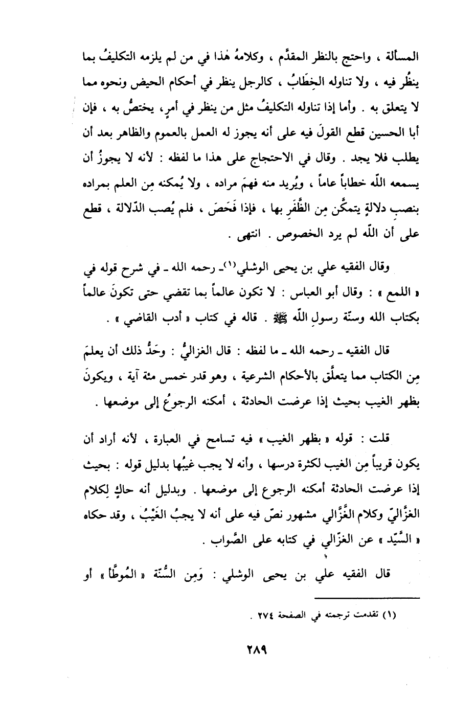 وقال الفقيه علي بن يحيى الوشلي (¬1) -رحمه الله- في شرح قوله في " اللمع ": وقال أبو العباس: لا تكون عالماً بما تقضي حتى تكونَ عالماًً بكتاب الله وسنة رسولِ الله - صلى الله عليه وسلم -. قاله في كتاب " أدب القاضي ".