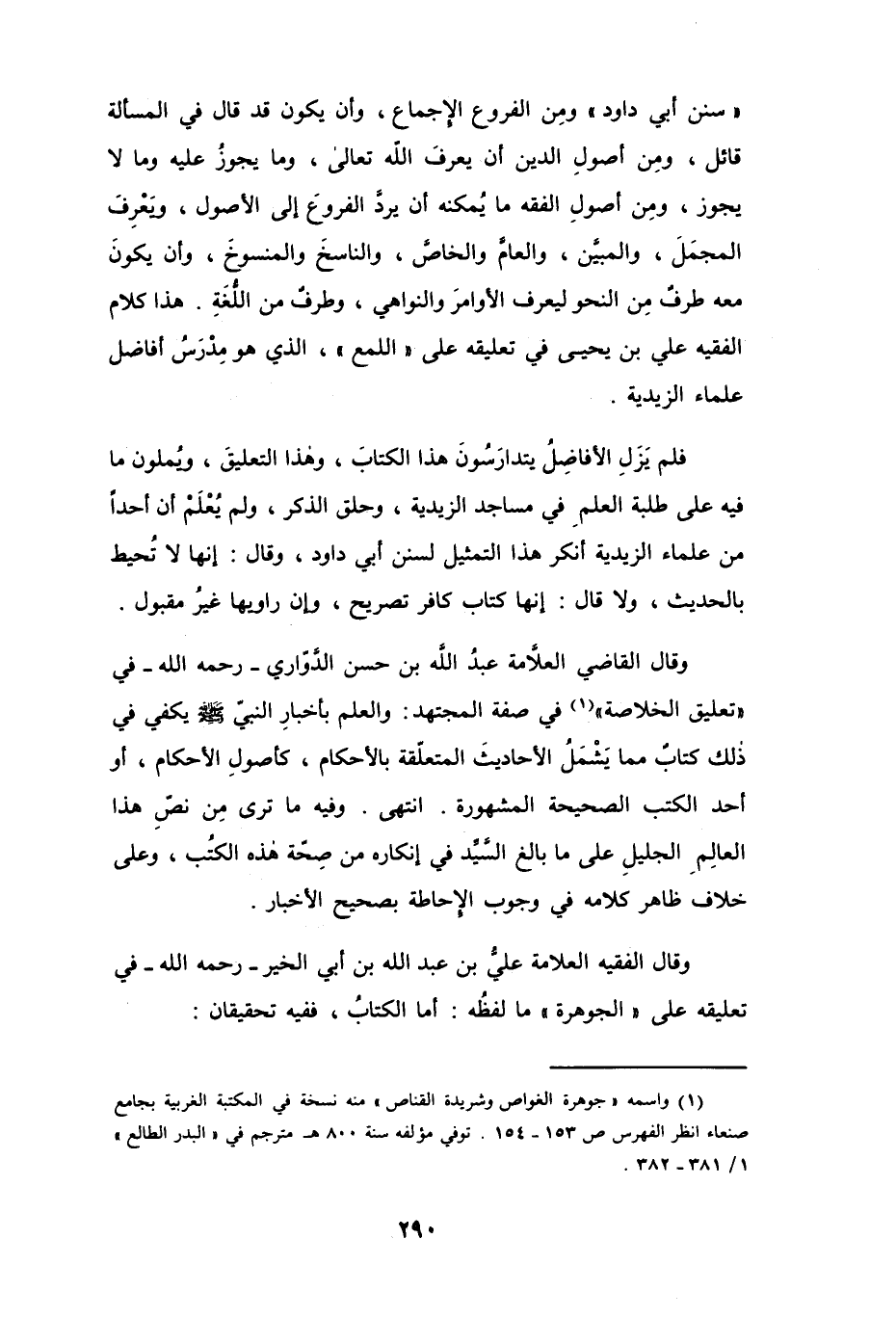 " سنن أبي داود " ومِن الفروع الإجماع، وأن يكون قد قال في المسألة قائل، ومِن أصولِ الدين أن يعرفَ الله تعالى، وما يجوزُ عليه وما لا يجوز، ومِن أصولِ الفقه ما يُمكنه أن يردَّ الفروعَ إلى الأصول، وَيعْرِف المجمَلَ، والمبيَّن، والعامَّ والخاصَّ، والناسخَ والمنسوخَ، وأن يكونَ معه طرفٌ مِن النحو ليعرف الأوامرَ والنواهي، وطرفٌ من اللُّغَةِ. هذا كلام الفقيه علي بن يحيى في تعليقه على " اللمع "، الذي هو مِدْرَسُ أفاضل علماء الزيدية.