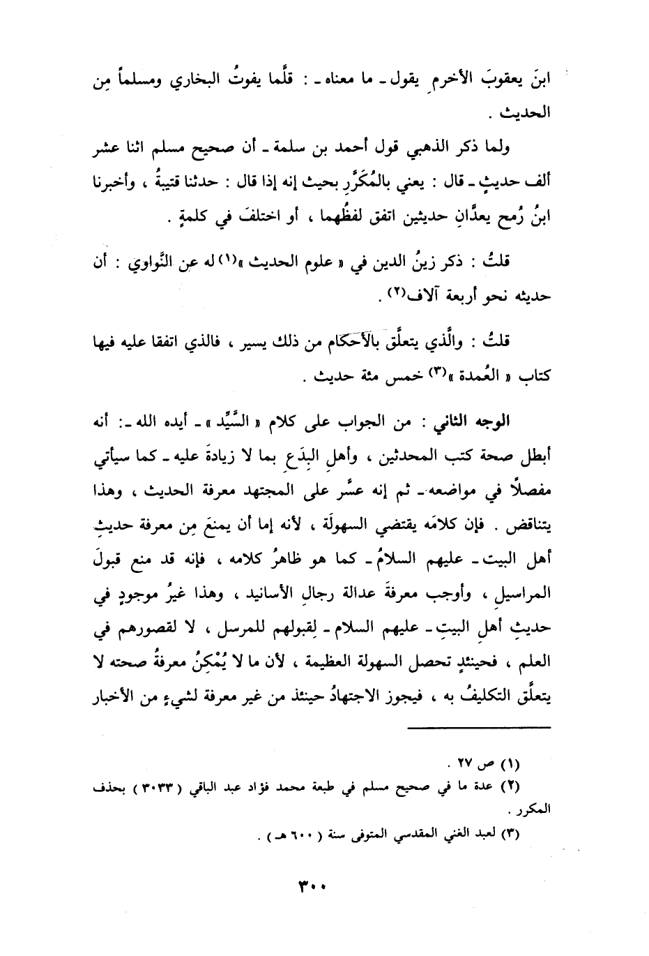الوجه الثاني: من الجواب على كلام " السَّيِّد " -أيده الله-: أنه أبطل صحة كتب المحدثين، وأهلِ البِدَعِ بما لا زيادةَ عليه -كما سيأتي مفصلاً مواضعه- ثم إنه عسَّر على المجتهد معرفة الحديث، وهذا يتناقض. فإن كلامَه يقتضي السهولة، لأنه إما أن يمنعَ مِن معرفة حديثِ أهل البيت -عليهم السلامُ- كما هو ظاهرُ كلامه، فإنه قد منع قبولَ المراسيلِ، وأوجب معرفةَ عدالة رجالِ الأسانيد، وهذا غيرُ موجودٍ في حديثِ أهل البيت -عليهم السلام- لِقبولهم للمرسل، لا لقصورهم في العلم، فحينئذٍ تحصل السهولة العظيمة، لأن ما لا يُمْكِنُ معرفةُ صحته لا يتعلَّق التكليفُ به، فيجوز الاجتهادُ حينئذ من غير معرفة لشيءٍ من الأخبار