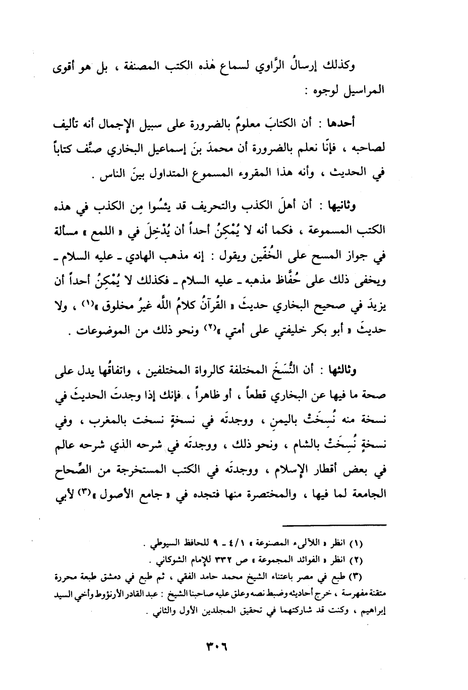 وثانيها: أن أهلَ الكذب والتحريف قد يئسُوا من الكذب في هذه الكتب المسموعة، فكما أنه لا يُمْكِنُ أحداً أن يُدْخِلَ في " اللمع " مسألة في جواز المسح على الخُفين ويقول: إنه مذهب الهادي -عليه السلام- ويخفي ذلك على حُفَّاظ مذهبه -عليه السلام- فكذلك لا يُمْكِنُ أحداً أن يزيدَ في صحيح البخاري حديثَ " القُرآنُ كلامُ الله غيرُ مخلوق " (¬1)، ولا حديثَ " أبو بكر خليفتي على أمتي " (¬2) ونحو ذلك من الموضوعات.