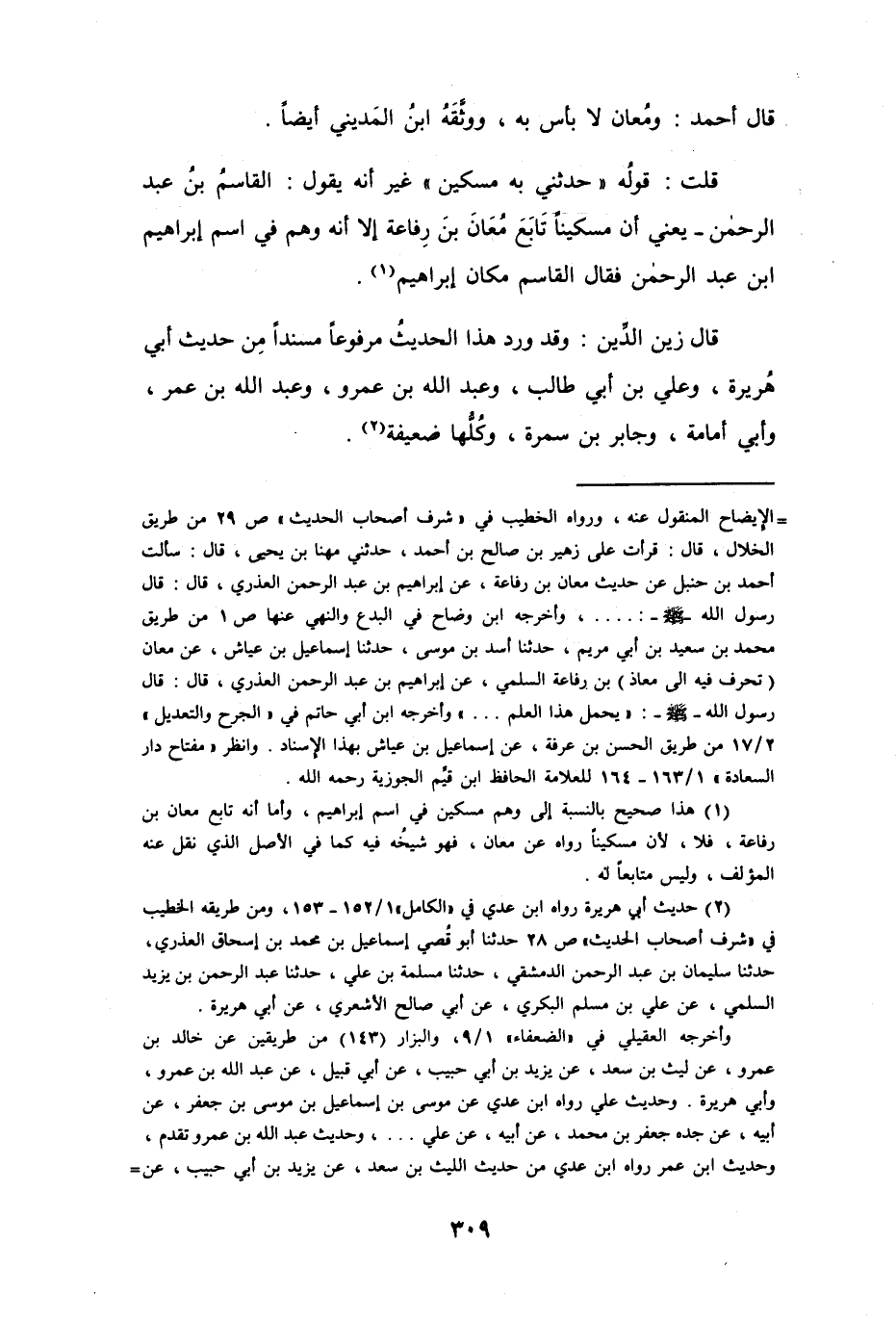 = الإيضاح المنقول عنه، ورواه الخطيب في " شرف أصحاب الحديث " ص 29 من طريق الخلال، قال: قرأت على زهير بن صالح بن أحمد، حدثني مهنا بن يحيى " قال: سألت أحمد بن حنبل عن حديث معان بن رفاعة، عن إبراهيم بن عبد الرحمن العذري " قال: قال رسول الله - صلى الله عليه وسلم -: .... ، وأخرجه ابن وضاح في البدع والنهي عنها ص 1 من طريق محمد بن سعيد بن أبي مريم، حدثنا أسد بن موسى، حدثنا إسماعيل بن عياش، عن معان (تحرف فيه إلى معاذ) بن رفاعة السلمي، عن إبراهيم بن عبد الرحمن العذري، قال: قال رسول الله - صلى الله عليه وسلم -: " يحمل هذا العلم ... " وأخرجه ابن أبي حاتم في " الجرح والتعديل " 2/ 17 من طريق الحسن بن عرفة، عن إسماعيل بن عياش بهذا الإسناد. وانظر " مفتاح دار السعادة " 1/ 163 - 164 للعلامة الحافظ ابن قيِّم الجوزية رحمه الله.