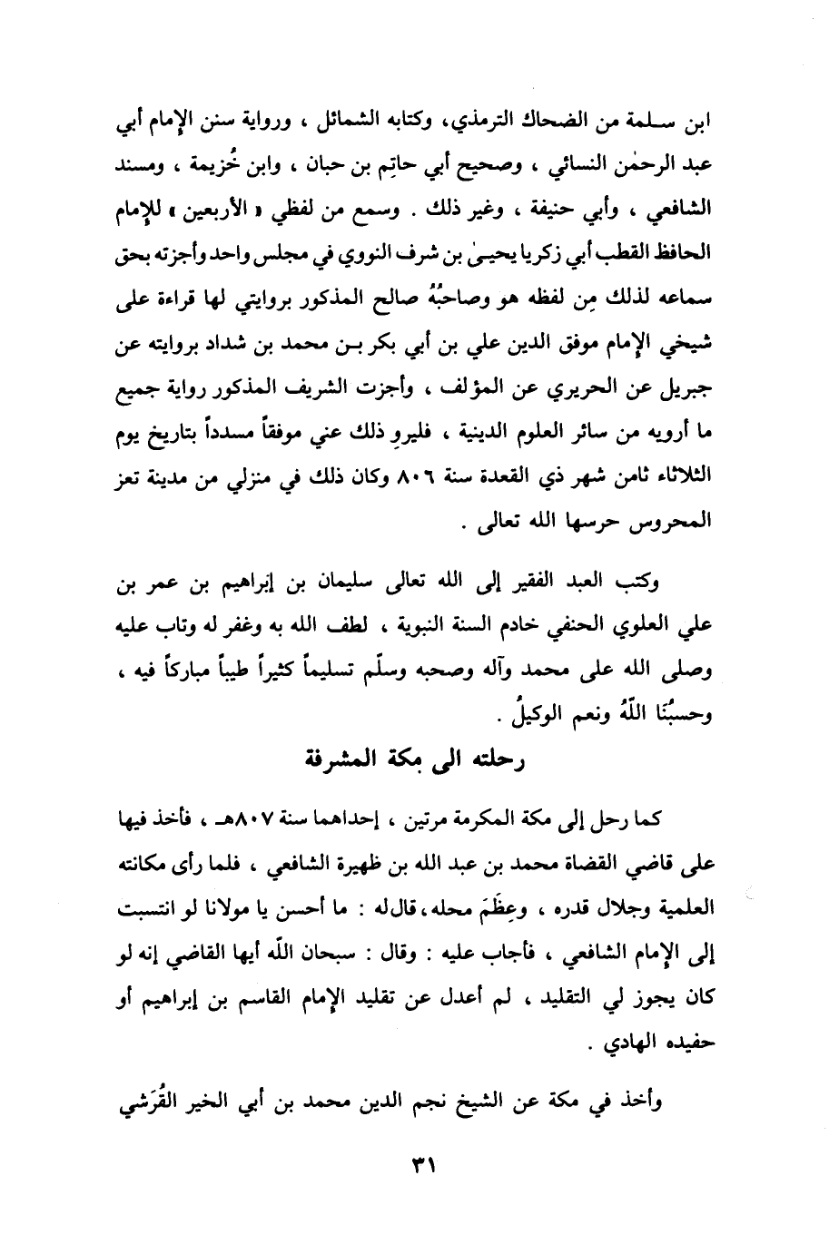 ابن سلمة من الضحاك الترمذي، وكتابه الشمائل، ورواية سنن الإمام أبي عبد الرحمن النسائي، وصحيح أبي حاتِم بن حبان، وابن خُزيمة، ومسند الشافعي، وأبي حنيفة، وغير ذلك. وسمع من لفظي " الأربعين " للإمام الحافظ القطب أبي زكريا يحيى بن شرف النووي في مجلس واحد وأجزته بحق سماعه لذلك من لفظه هو وصاحبه صالح المذكور بروايتي لها قراءة على شيخي الإمام موفق الدين علي بن أبي بكر بن محمد بن شداد بروايته عن جبريل عن الحريري عن المؤلف، وأجزت الشريف المذكور رواية جميع ما أرويه من سائر العلوم الدينية، فليروِ ذلك عني موفقاً مسدداً بتاريخ يوم الثلاثاء ثامن شهر ذي القعدة سنة 806 وكان ذلك في منزلي من مدينة تعز المحروس حرسها الله تعالى.