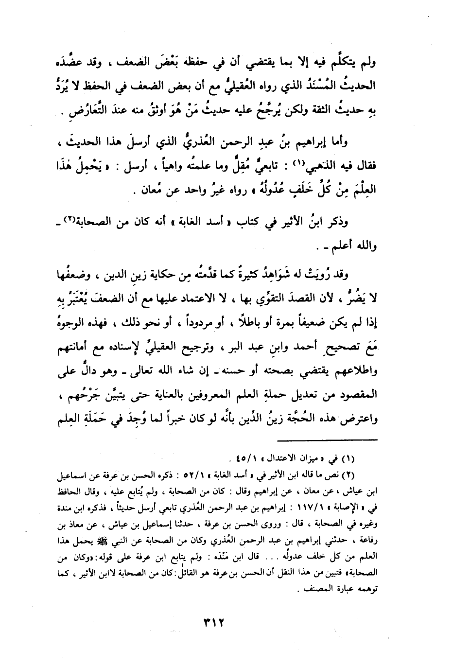 (¬2) نص ما قاله ابن الأثير في " أسد الغابة " 1/ 52: ذكره الحسن بن عرفة عن إسماعيل ابن عياش، عن معان، عن إبراهيم وقال: كان من الصحابة، ولم يُتابع عليه، وقال الحافظ في " الإصابة " 1/ 117: إبراهيم بن عبد الرحمن العُذري تابعي أرسل حديثاً، فذكره ابن مندة وغيره في الصحابة، قال: وروى الحسن بن عرفة، حدثنا إسماعيل بن عياش، عن معاذ بن رفاعة، حدثني إبراهيم بن عبد الرحمن العُذري وكان من الصحابة عن النبي - صلى الله عليه وسلم - يحمل هذا العلم من كل خلف عدولُه ... قال ابن مَنْدَه: ولم يتابع ابن عرفة على قوله: " وكان من الصحابة " فتبين من هذا النقل أن الحسن بن عرفة هو القائل: كان من الصحابة لا ابن الأثير، كما توهمه عبارة المصنف.
